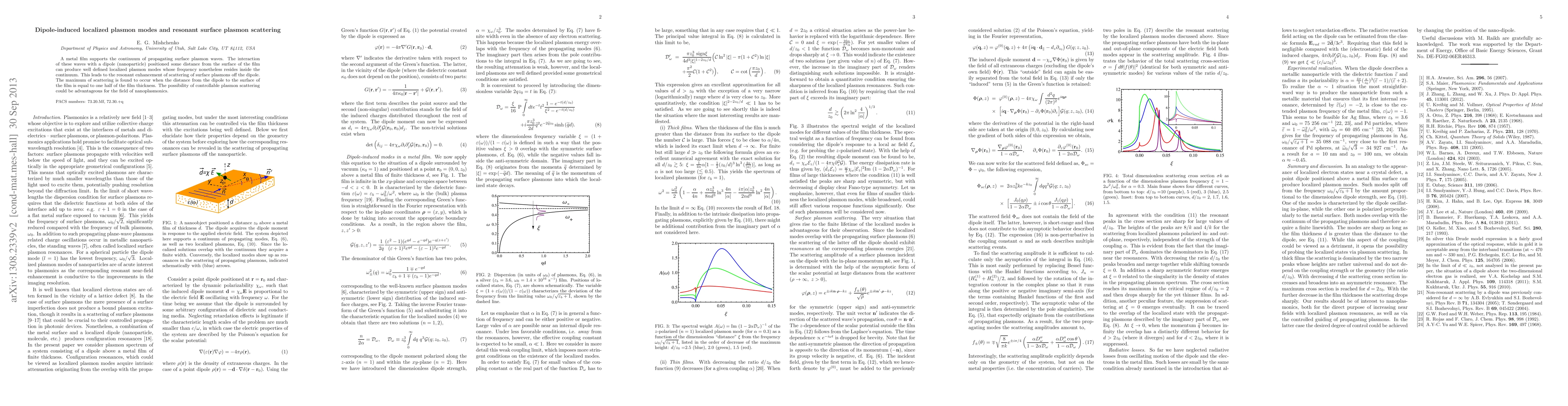 This paper investigates how a dipole positioned near a metal film can induce localized plasmon modes, enhancing surface plasmon scattering. The study finds that maximum scattering occurs when the dipole is at half the film's thickness, suggesting potential for controlling plasmon scattering in nanoplasmonics applications.