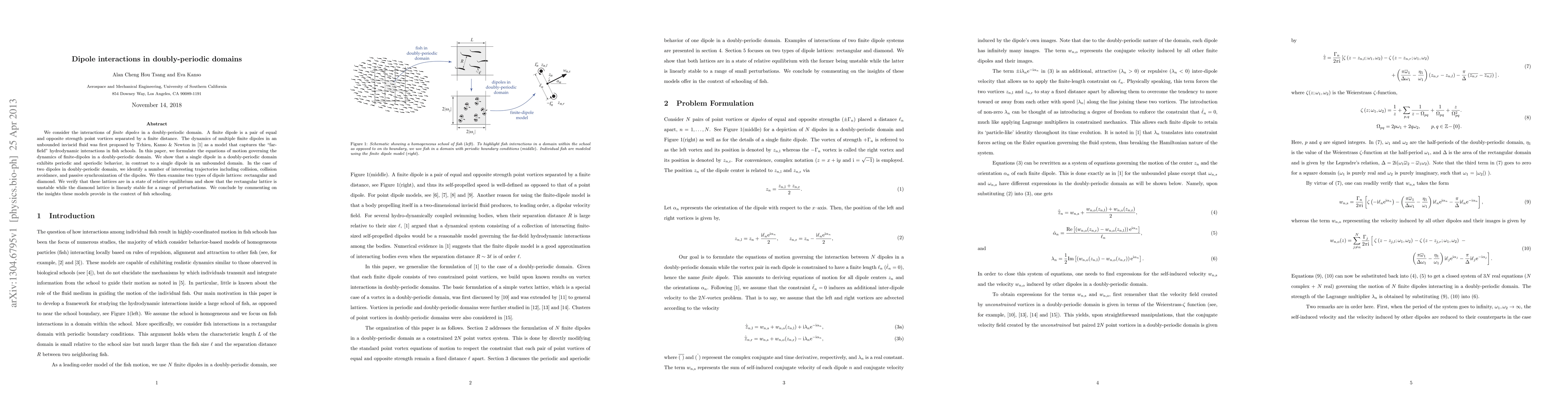 This paper formulates the dynamics of finite dipoles in doubly-periodic domains, revealing periodic and aperiodic behaviors of single dipoles and complex interactions between two dipoles, including collision and synchronization. It also examines the stability of rectangular and diamond dipole lattices, finding the diamond lattice to be stable, providing insights into fish schooling models.