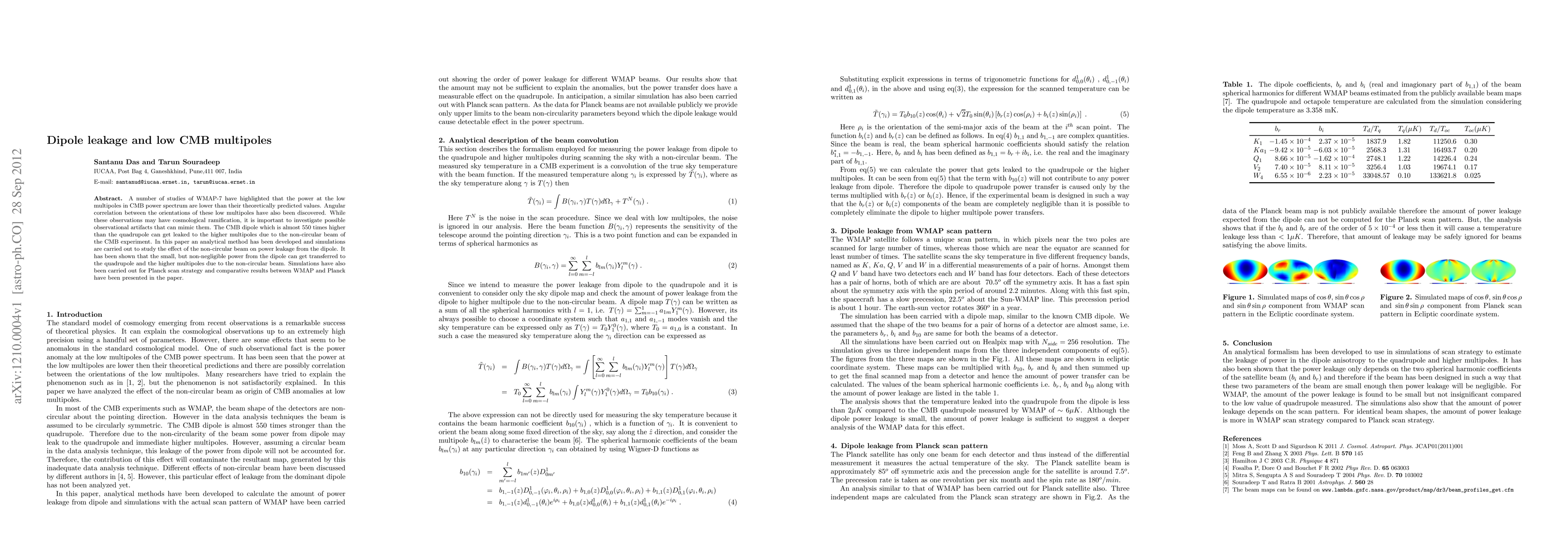 This paper investigates the leakage of power from the CMB dipole into higher multipoles due to the non-circular beam of CMB experiments, potentially explaining the observed lower power at low multipoles. Analytical methods and simulations show that this leakage can mimic cosmological observations, with comparative results between WMAP and Planck scan strategies presented.