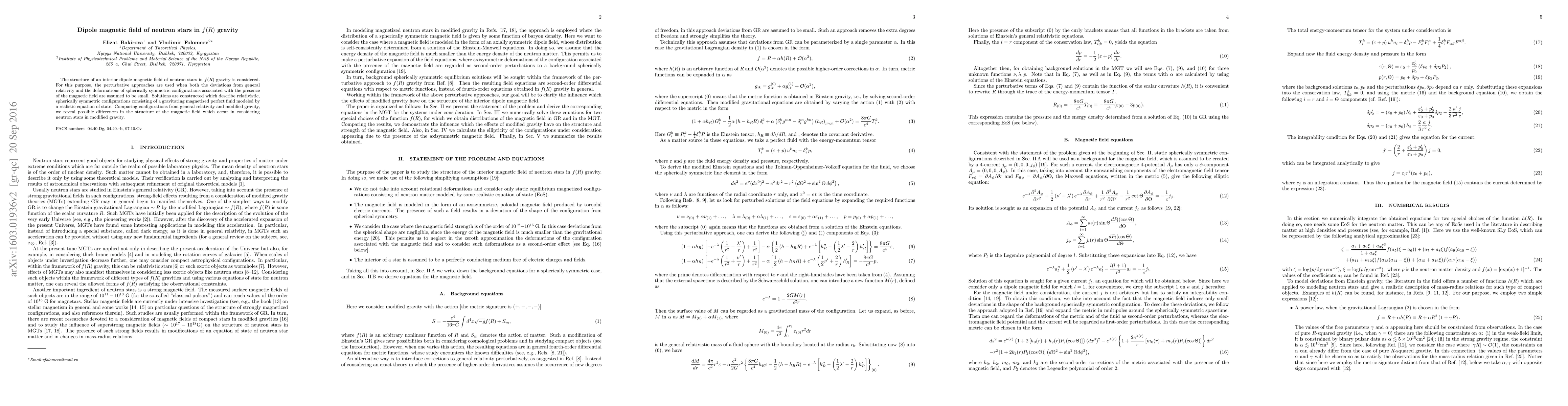 This paper investigates the interior dipole magnetic field of neutron stars under $f(R)$ gravity using perturbative approaches. It constructs relativistic, spherically symmetric models of magnetized perfect fluids and reveals differences in magnetic field structure compared to general relativity.