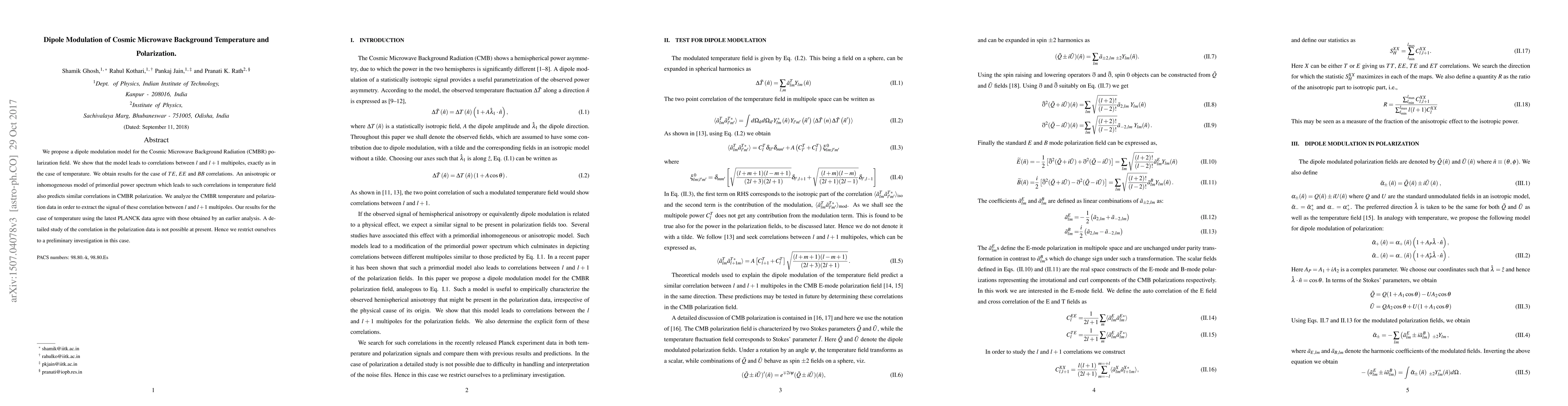 This paper proposes a dipole modulation model for the Cosmic Microwave Background Radiation (CMBR) polarization field, showing correlations between l and l+1 multipoles similar to those in the temperature field. The study analyzes Planck data to confirm these correlations in temperature and conducts a preliminary investigation for polarization.