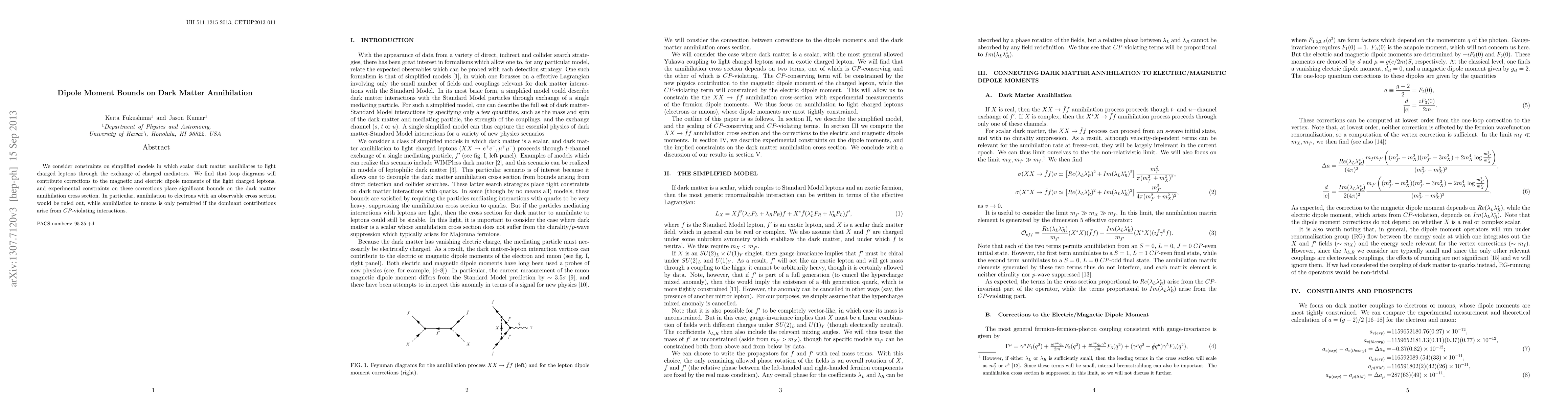 We consider constraints on simplified models in which scalar dark matter annihilates to light charged leptons through the exchange of charged mediators. We find that loop diagrams will contribute corrections to the magnetic and electric dipole moments of the light charged leptons, and experimental constraints on these corrections place significant bounds on the dark matter annihilation cross section. In particular, annihilation to electrons with an observable cross section would be ruled out, while annihilation to muons is only permitted if the dominant contributions arise from CP-violating interactions.