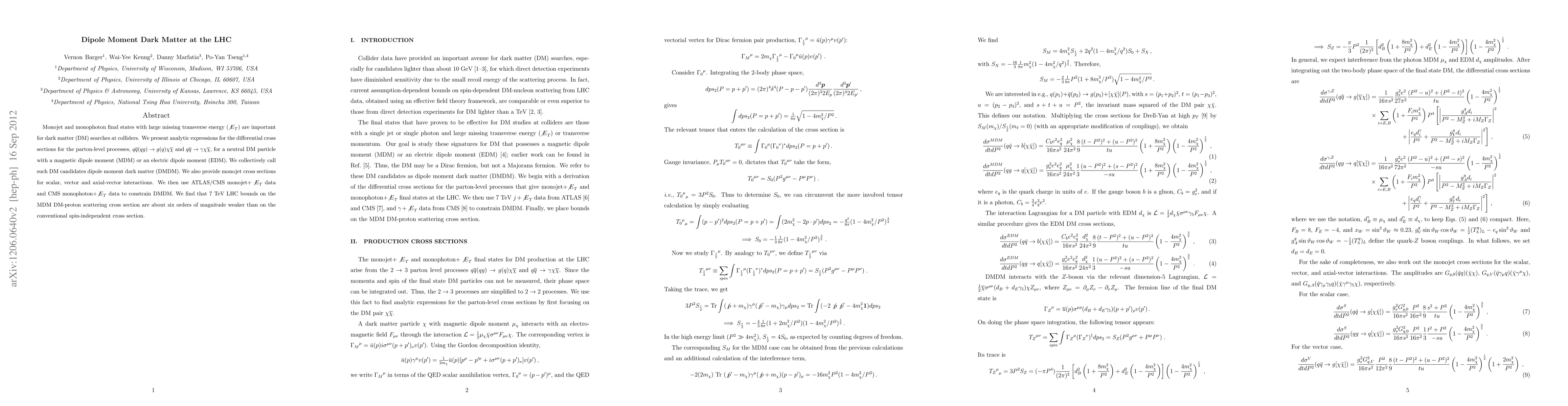 This paper presents analytic expressions for differential cross sections of parton-level processes involving dipole moment dark matter (DMDM) at the LHC, and uses ATLAS/CMS data to constrain DMDM models. It finds that LHC bounds on magnetic dipole moment DM-proton interactions are significantly weaker than conventional spin-independent cross sections.