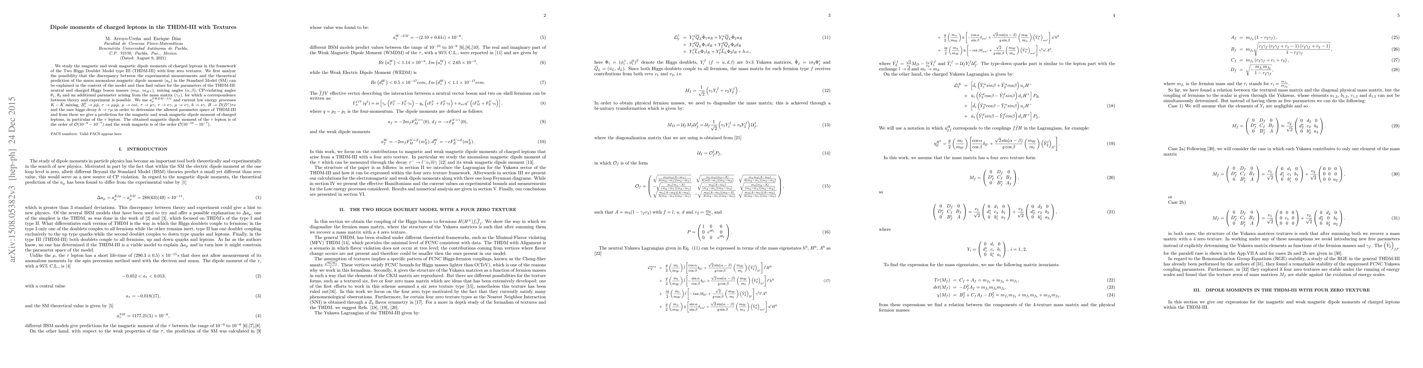 Researchers studied magnetic and weak magnetic dipole moments of charged leptons in a Two Higgs Doublet Model type III with four zero textures, predicting values for the muon and tau lepton's magnetic dipole moment.