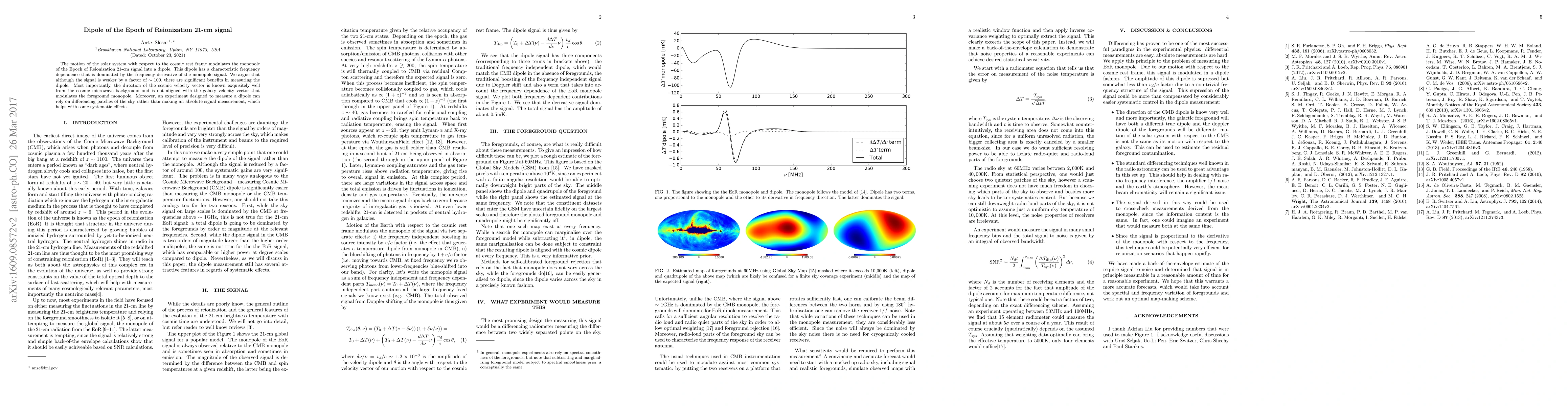 The research analyzes the Epoch of Reionization (EoR) 21-cm signal dipole caused by the solar system's motion relative to the cosmic rest frame, arguing for its measurement benefits despite being weaker by a factor of ~100.