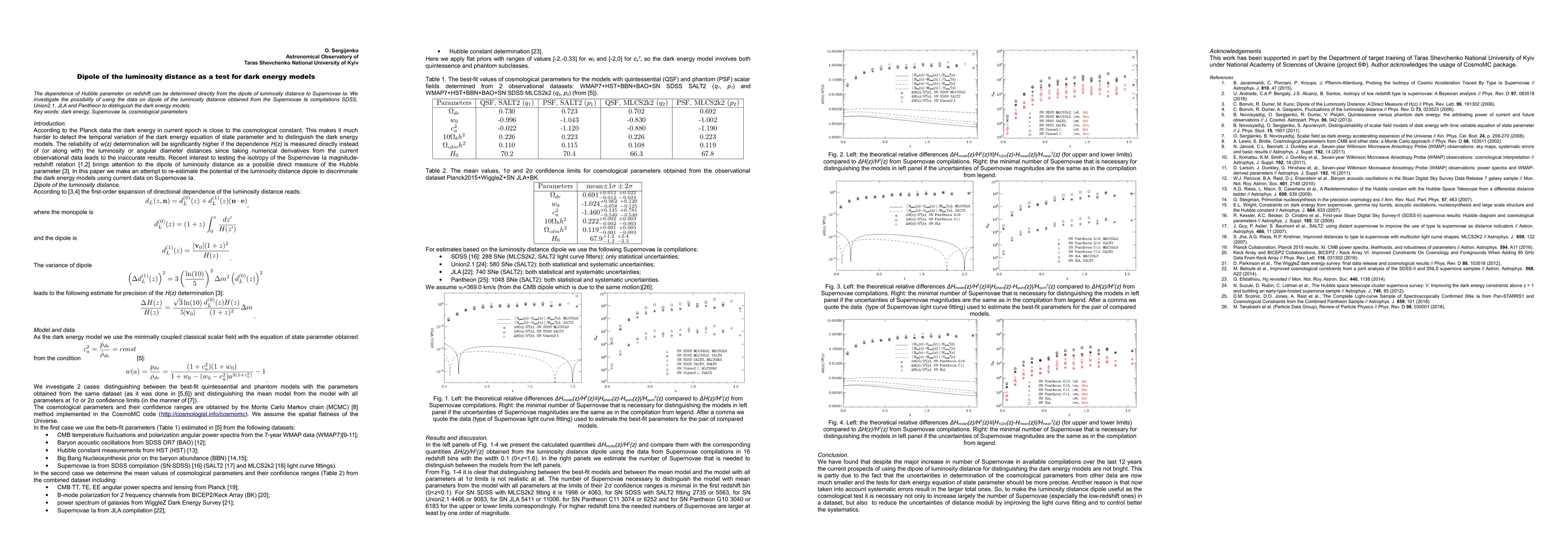 The dependence of Hubble parameter on redshift can be determined directly from the dipole of luminosity distance to Supernovae Ia. We investigate the possibility of using the data on dipole of the luminosity distance obtained from the Supernovae Ia compilations SDSS, Union2.1, JLA and Pantheon to distinguish the dark energy models.