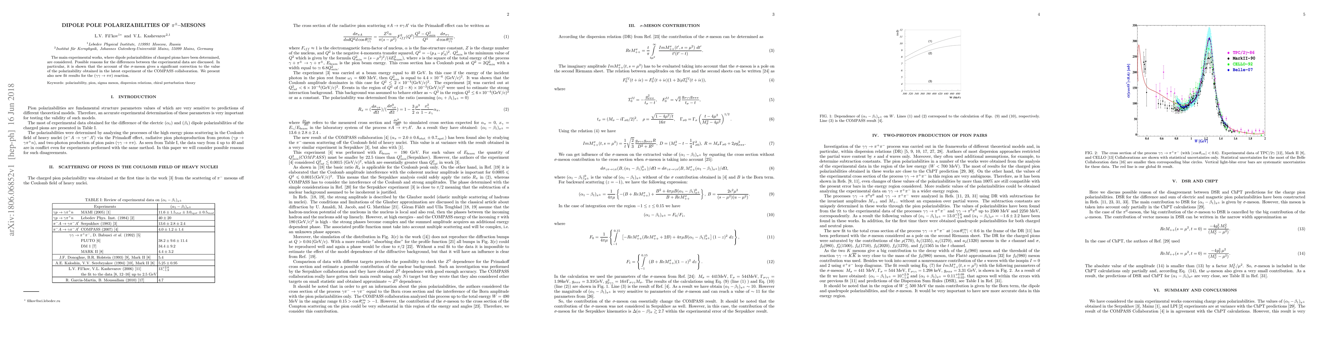 The main experimental works, where dipole polarizabilities of charged pions have been determined, are considered. Possible reasons for the differences between the experimental data are discussed. In particular, it is shown that the account of the $\sigma$-meson gives a significant correction to the value of the polarizability obtained in the latest experiment of the COMPASS collaboration. We present also new fit results for the $(\gamma\gamma\to\pi\pi)$ reaction.