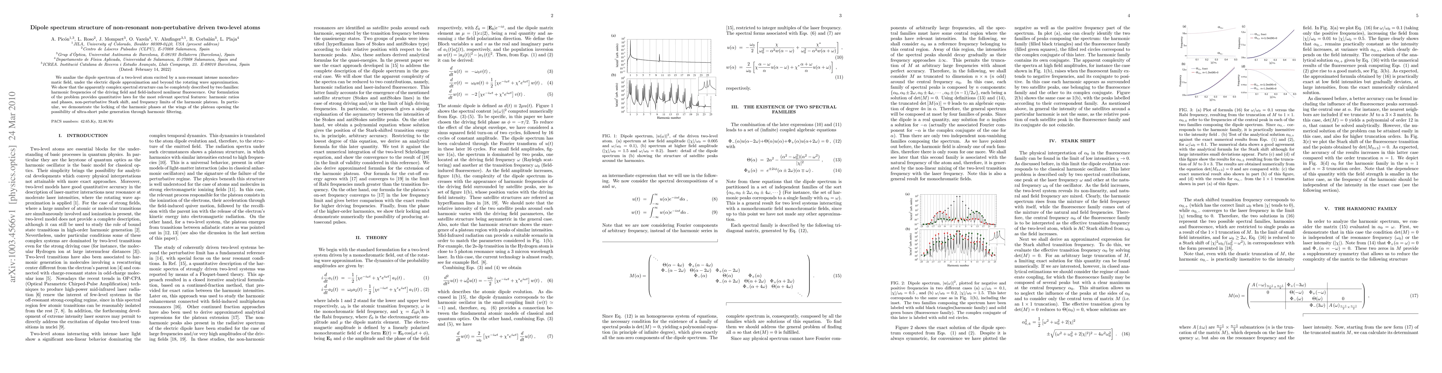 We analize the dipole spectrum of a two-level atom excited by a non-resonant intense monochromatic field, under the electric dipole approximation and beyond the rotating wave approximation. We show that the apparently complex spectral structure can be completely described by two families: harmonic frequencies of the driving field and field-induced nonlinear fluorescence. Our formulation of the problem provides quantitative laws for the most relevant spectral features: harmonic ratios and phases, non-perturbative Stark shift, and frequency limits of the harmonic plateau. In particular, we demonstrate the locking of the harmonic phases at the wings of the plateau opening the possibility of ultra-short pulse generation through harmonic filtering.