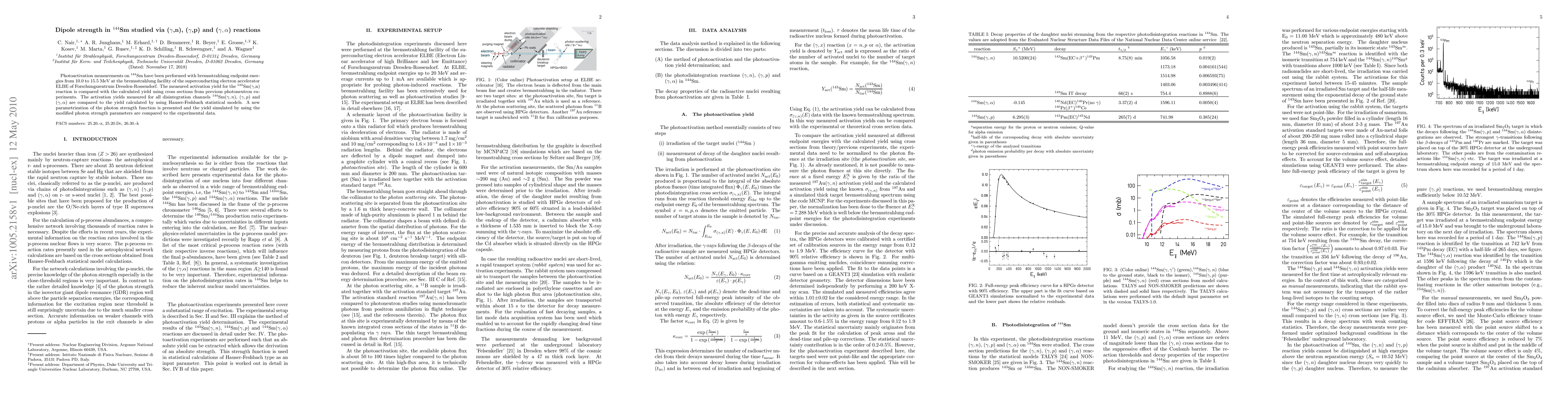 This study investigates 144Sm's dipole strength through (gamma,n), (gamma,p), and (gamma,alpha) reactions, comparing measured activation yields with calculated yields from previous experiments and Hauser-Feshbach models. A new photon strength function parametrization is presented, and its simulated yields are compared to experimental data.