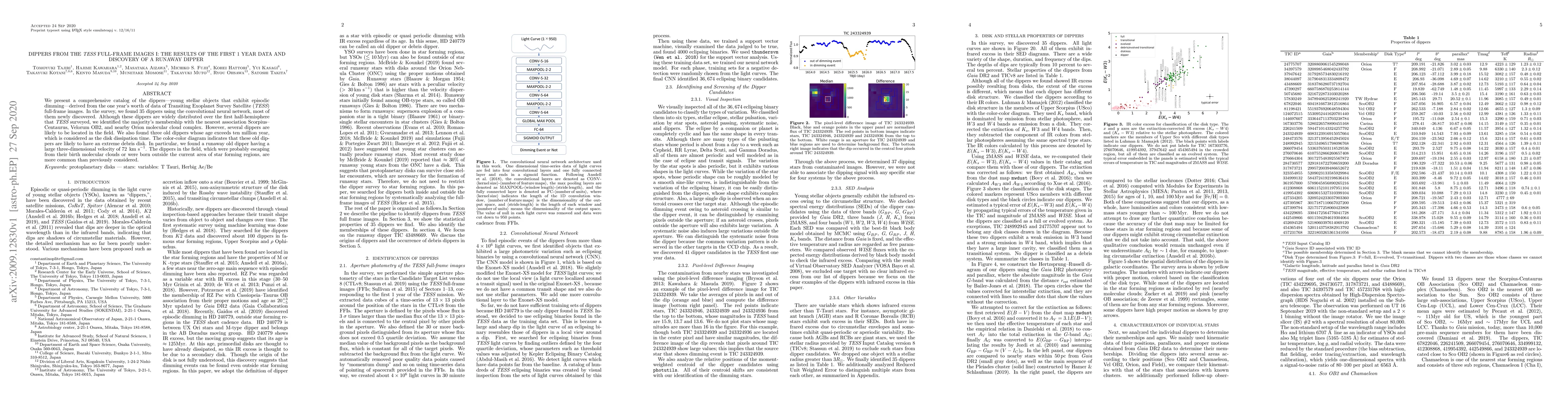 We present a comprehensive catalog of the dippers---young stellar objects that exhibit episodic dimming---derived from the one year's worth of data of Transiting Exoplanet Survey Satellite ($ TESS$) full-frame images. In the survey, we found 35 dippers using the convolutional neural network, most of them newly discovered. Although these dippers are widely distributed over the first half-hemisphere that $TESS$ surveyed, we identified the majority's membership with the nearest association Scorpius--Centaurus, Velorum OB2, and nearby Orion molecular cloud complex. However, several dippers are likely to be located in the field. We also found three old dippers whose age exceeds ten million year, which is considered as the disk dissipation time. The color-color diagram indicates that these old dippers are likely to have an extreme debris disk. In particular, we found a runaway old dipper having a large three-dimensional velocity of $72 \mathrm{km\ s}^{-1}$. The dippers in the field, which were probably escaping from their birth molecular clouds or were born outside the current area of star forming regions, are more common than previously considered.