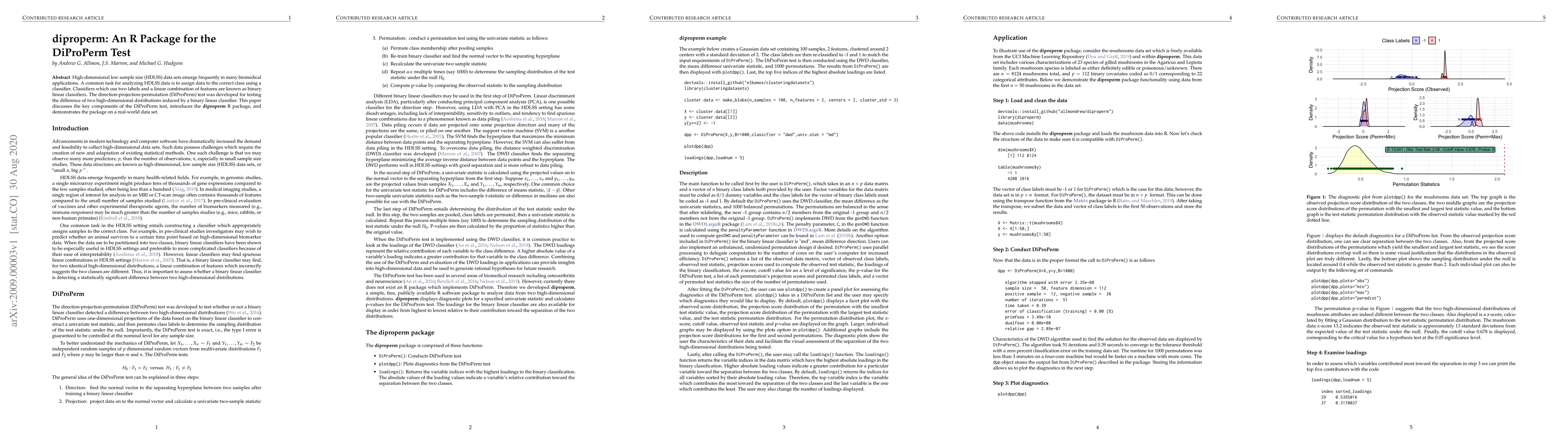 The DiProPerm test is designed for assessing differences in high-dimensional distributions using binary linear classifiers, and the diproperm R package implements this test. The paper details the package's components and showcases its application on a real-world dataset.