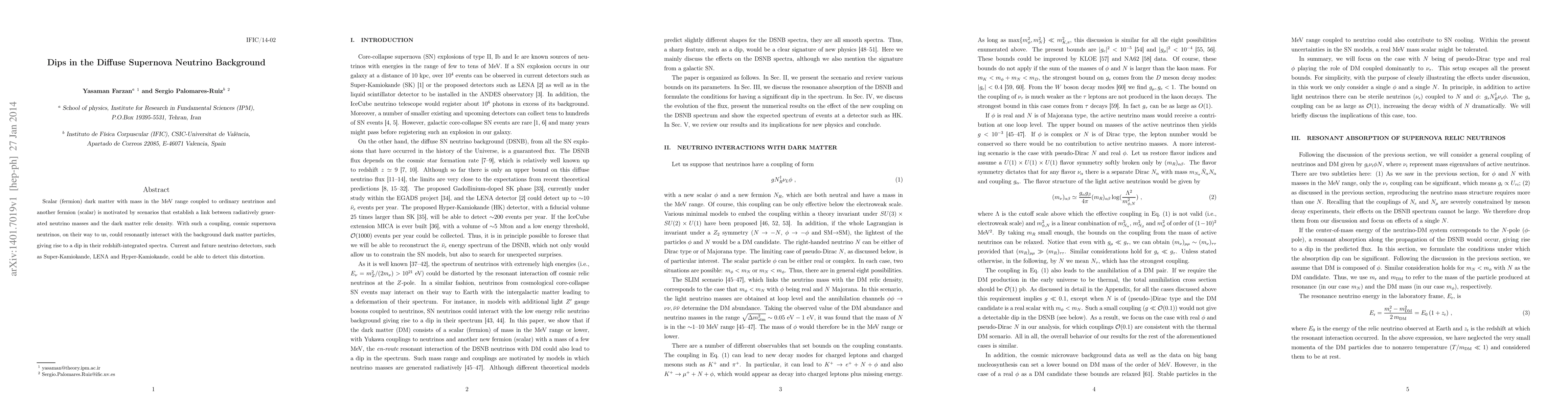 This paper explores how MeV-scale scalar (fermion) dark matter, linked to neutrino masses and relic density, could cause dips in the diffuse supernova neutrino background due to resonant interactions with cosmic supernova neutrinos. Future neutrino detectors like Super-Kamiokande and Hyper-Kamiokande may detect these spectral distortions.