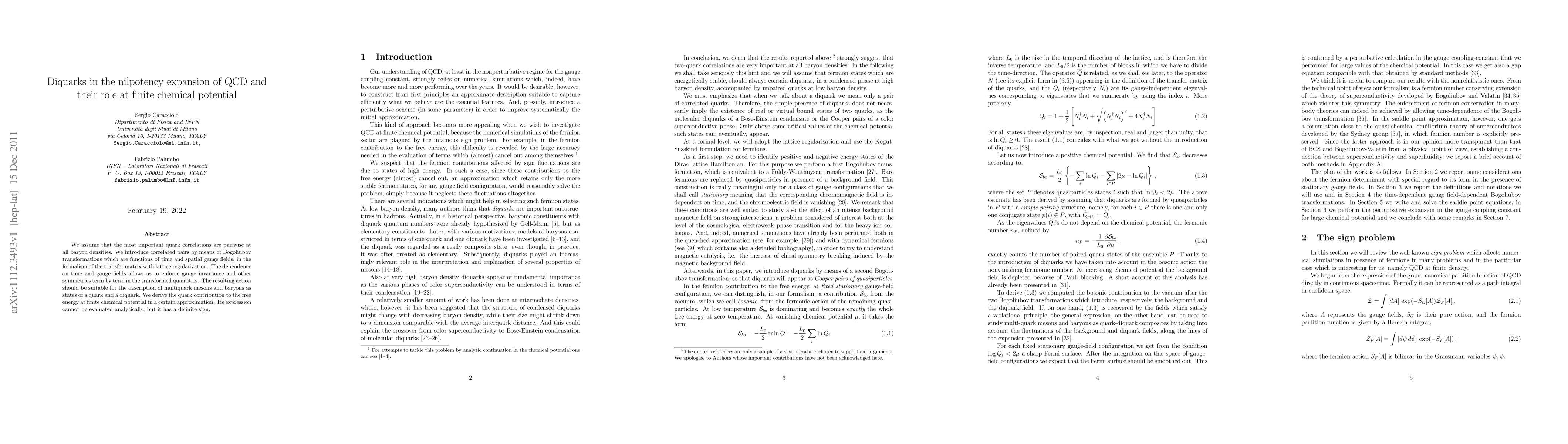 We assume that the most important quark correlations are pairwise at all baryon densities. We introduce correlated pairs by means of Bogoliubov transformations which are functions of time and spatial gauge fields, in the formalism of the transfer matrix with lattice regularization. The dependence on time and gauge fields allows us to enforce gauge invariance and other symmetries term by term in the transformed quantities. The resulting action should be suitable for the description of multiquark mesons and baryons as states of a quark and a diquark. We derive the quark contribution to the free energy at finite chemical potential in a certain approximation. Its expression cannot be evaluated analytically, but it has a definite sign.
