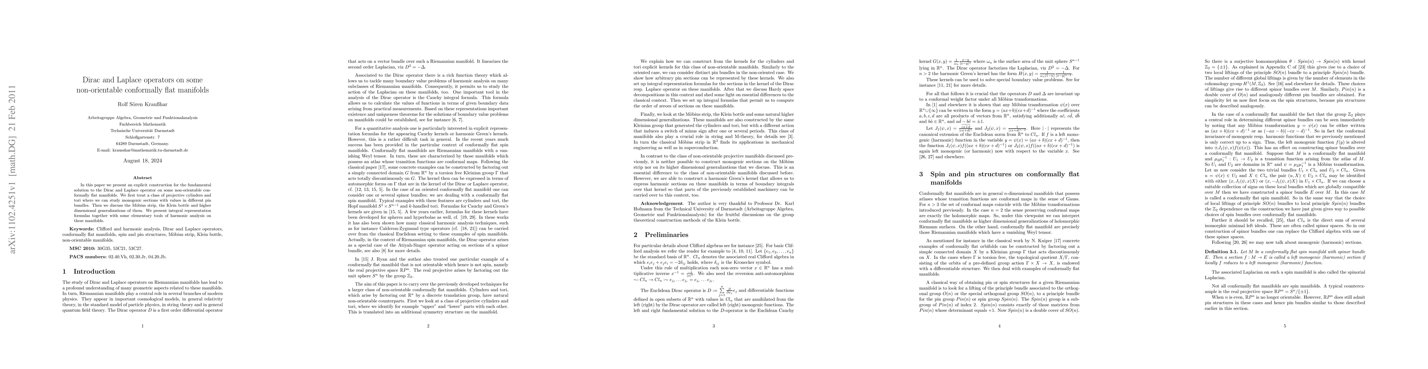 This paper constructs fundamental solutions for the Dirac and Laplace operators on non-orientable conformally flat manifolds, focusing on projective cylinders, tori, the M\"obius strip, and the Klein bottle, using integral representation formulas and harmonic analysis techniques.