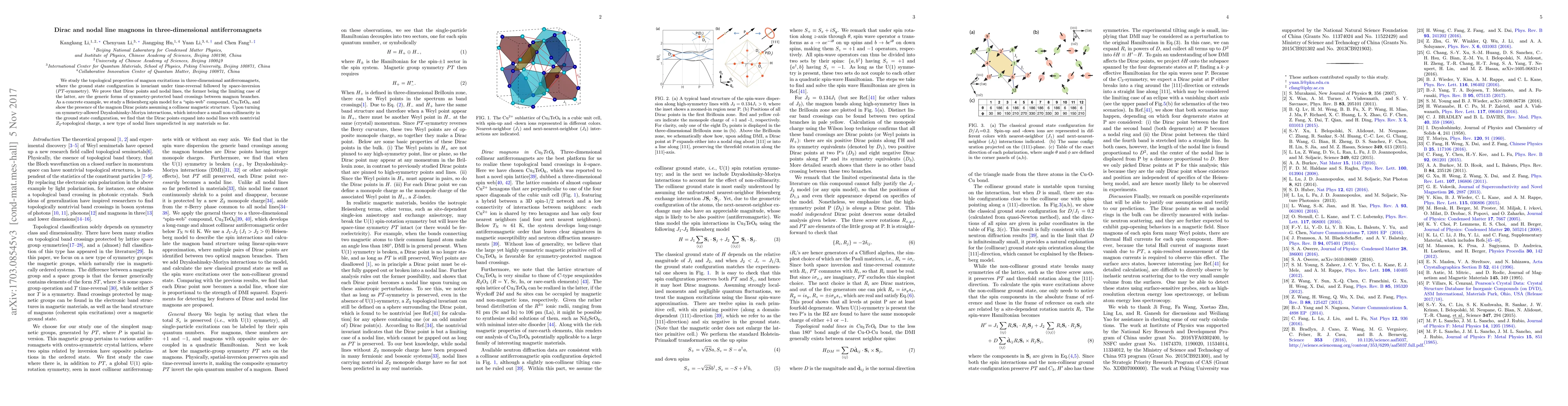 We study the topological properties of magnon excitations in three-dimensional antiferromagnets, where the ground state configuration is invariant under time-reversal followed by space-inversion ($PT$-symmetry). We prove that Dirac points and nodal lines, the former being the limiting case of the latter, are the generic forms of symmetry-protected band crossings between magnon branches. As a concrete example, we study a Heisenberg spin model for a "spin-web" compound, Cu$_3$TeO$_6$, and show the presence of the magnon Dirac points assuming a collinear magnetic structure. Upon turning on symmetry-allowed Dzyaloshinsky-Moriya interactions, which introduce a small non-collinearity in the ground state configuration, we find that the Dirac points expand into nodal lines with nontrivial $Z_2$-topological charge, a new type of nodal lines unpredicted in any materials so far.