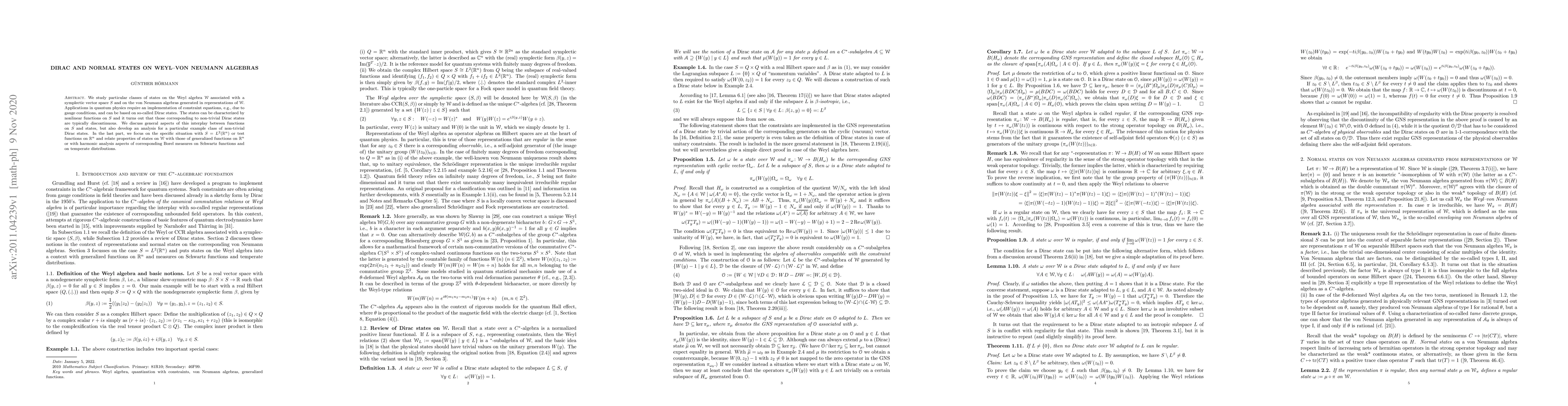 We study particular classes of states on the Weyl algebra $\mathcal{W}$ associated with a symplectic vector space $S$ and on the von Neumann algebras generated in representations of $\mathcal{W}$. Applications in quantum physics require an implementation of constraint equations, e.g., due to gauge conditions, and can be based on so-called Dirac states. The states can be characterized by nonlinear functions on $S$ and it turns out that those corresponding to non-trivial Dirac states are typically discontinuous. We discuss general aspects of this interplay between functions on $S$ and states, but also develop an analysis for a particular example class of non-trivial Dirac states. In the last part, we focus on the specific situation with $S = L^2(\mathbb{R}^n)$ or test functions on $\mathbb{R}^n$ and relate properties of states on $\mathcal{W}$ with those of generalized functions on $\mathbb{R}^n$ or with harmonic analysis aspects of corresponding Borel measures on Schwartz functions and on temperate distributions.