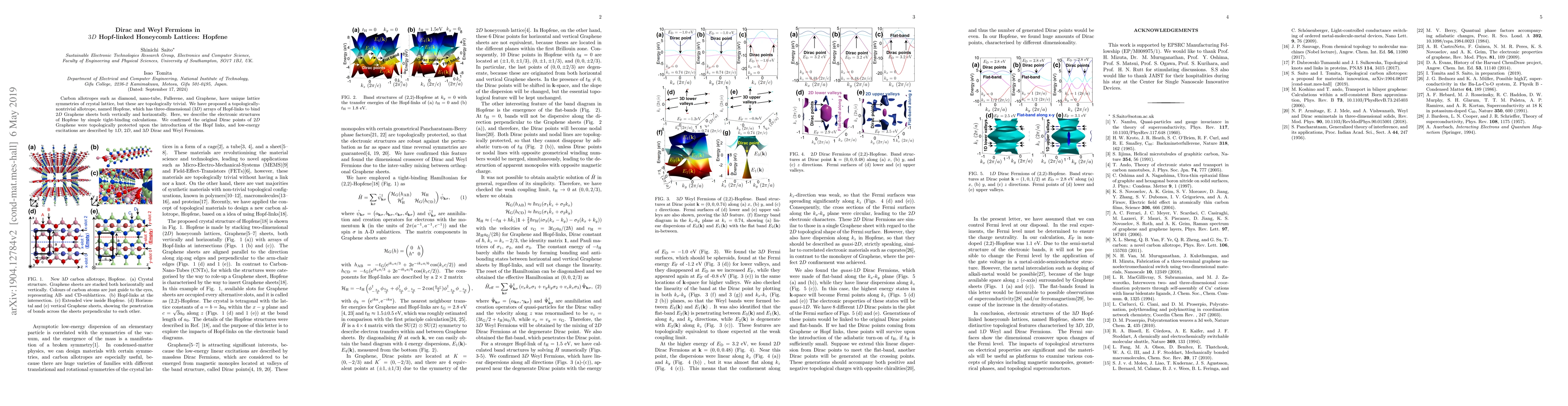 Carbon allotropes such as diamond, nano-tube, Fullerene, and Graphene, have unique lattice symmetries of crystal lattice, but these are topologically trivial. We have proposed a topologically-nontrivial allotrope, named Hopfene, which has three-dimensional (3D) arrays of Hopf-links to bind 2D Graphene sheets both vertically and horizontally. Here, we describe the electronic structures of Hopfene by simple tight-binding calculations. We confirmed the original Dirac points of 2D Graphene were topologically protected upon the introduction of the Hopf links, and low-energy excitations are described by 1D, 2D, and 3D Dirac and Weyl Fermions.