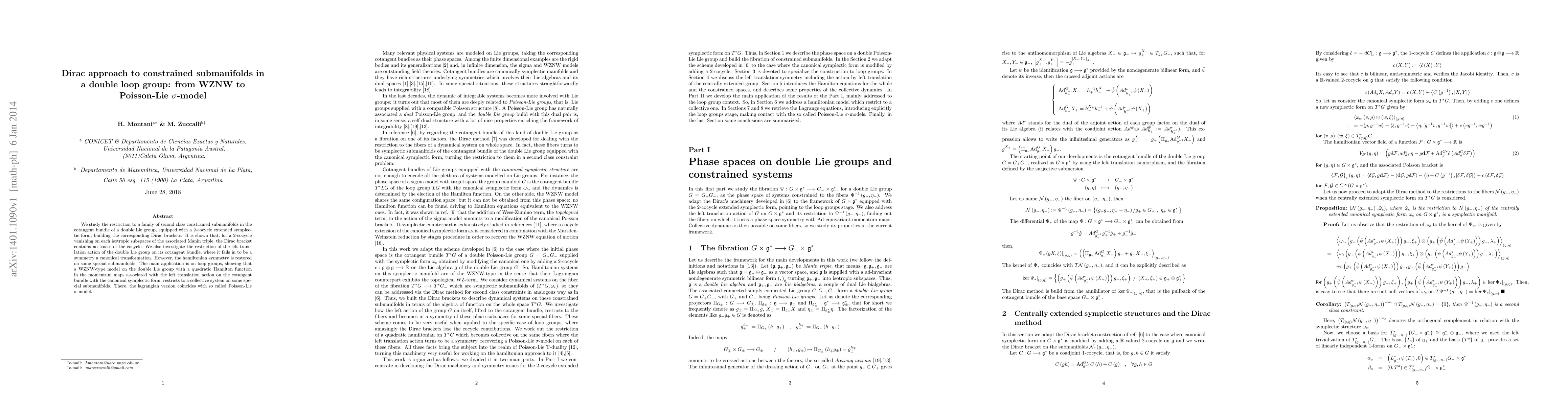 We study the restriction to a family of second class constrained submanifolds in the cotangent bundle of a double Lie group, equipped with a 2-cocycle extended symplectic form, building the corresponding Dirac brackets. It is shown that, for a 2-cocycle vanishing on each isotropic subspaces of the associated Manin triple, the Dirac bracket contains no traces of the cocycle. We also investigate the restriction of the left translation action of the double Lie group on its cotangent bundle, where it fails in to be a symmetry a canonical transformation. However, the hamiltonian symmetry is restored on some special submanifolds. The main application is on loop groups, showing that a WZNW-type model on the double Lie group with a quadratic Hamilton function in the momentum maps associated with the left translation action on the cotangent bundle with the canonical symplectic form, restricts to a collective system on some special submanifolds. There, the lagrangian version coincides with so called Poisson-Lie $\sigma $-model.