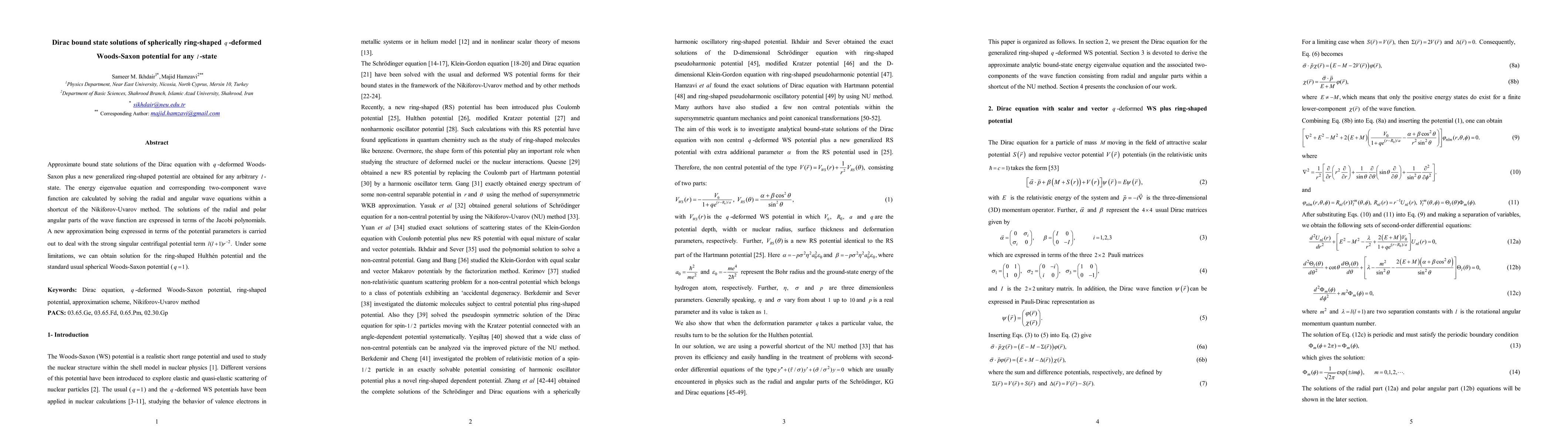 Approximate bound state solutions of the Dirac equation with -deformed Woods-Saxon plus a new generalized ring-shaped potential are obtained for any arbitrary L-state. The energy eigenvalue equation and corresponding two-component wave function are calculated by solving the radial and angular wave equations within a shortcut of the Nikiforov-Uvarov method. The solutions of the radial and polar angular parts of the wave function are expressed in terms of the Jacobi polynomials. A new approximation being expressed in terms of the potential parameters is carried out to deal with the strong singular centrifugal potential term L(L+1)/r^2. Under some limitations, we can obtain solution for the ring-shaped Hulth\'en potential and the standard usual spherical Woods-Saxon potential (q=1).