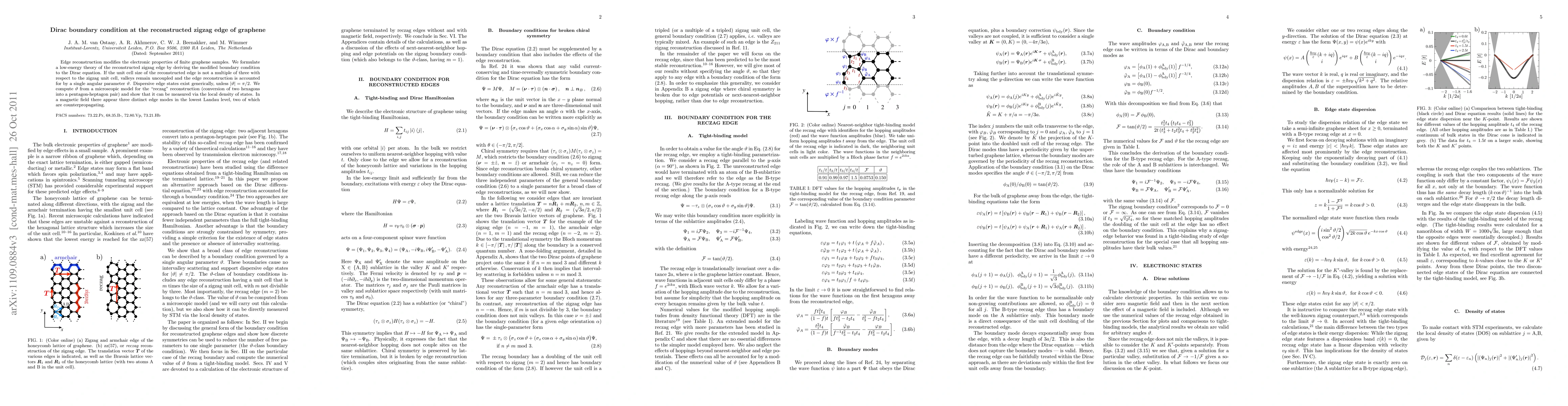 This paper formulates a low-energy theory of the reconstructed zigzag edge in graphene, deriving a modified Dirac boundary condition that accounts for edge reconstruction. It shows that dispersive edge states exist unless the angular parameter $\vartheta$ equals $\pi/2$, and computes $\vartheta$ for the "reczag" reconstruction, demonstrating its measurability via local density of states, with three distinct edge modes appearing in a magnetic field.