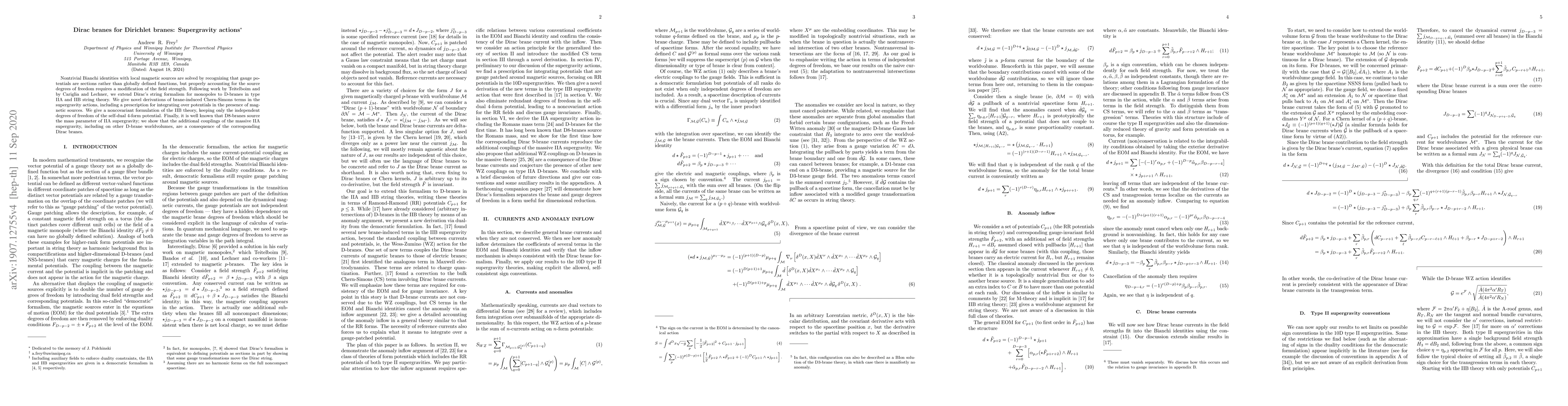 Nontrivial Bianchi identities with local magnetic sources are solved by recognizing that gauge potentials are sections rather than globally defined functions, but properly accounting for the source degrees of freedom requires a modification of the field strength. Following work by Teitelboim and by Cariglia and Lechner, we extend Dirac's string formalism for monopoles to D-branes in type IIA and IIB string theory. We give novel derivations of brane-induced Chern-Simons terms in the supergravity actions, including a prescription for integrating over potentials in the presence of magnetic sources. We give a noncovariant formulation of the IIB theory, keeping only the independent degrees of freedom of the self-dual 4-form potential. Finally, it is well-known that D8-branes source the mass parameter of IIA supergravity; we show that the additional couplings of the massive IIA supergravity, including on other D-brane worldvolumes, are a consequence of the corresponding Dirac branes.