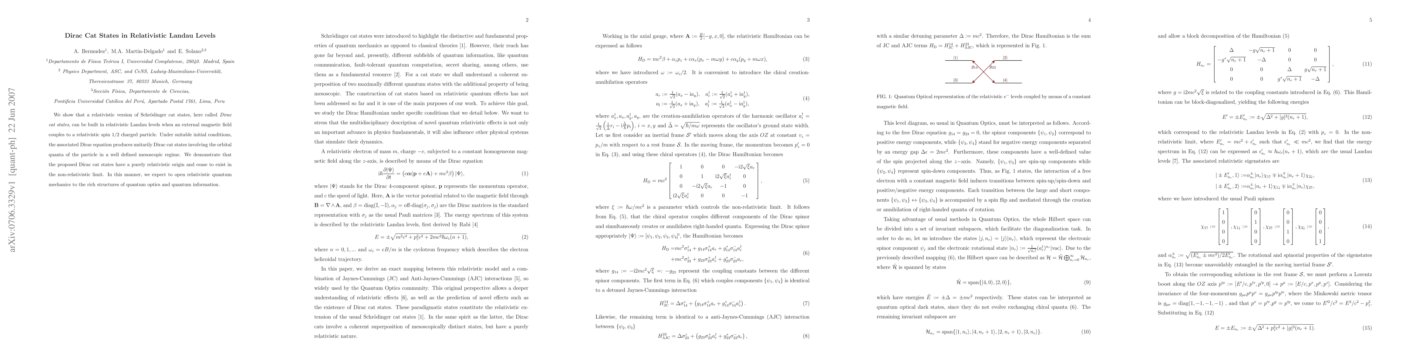 This paper presents a relativistic version of Schrödinger cat states, termed Dirac cat states, formed in relativistic Landau levels through an external magnetic field acting on a spin 1/2 charged particle. The study reveals that these states are purely relativistic and vanish in non-relativistic scenarios, potentially enriching relativistic quantum mechanics with quantum optics and information structures.