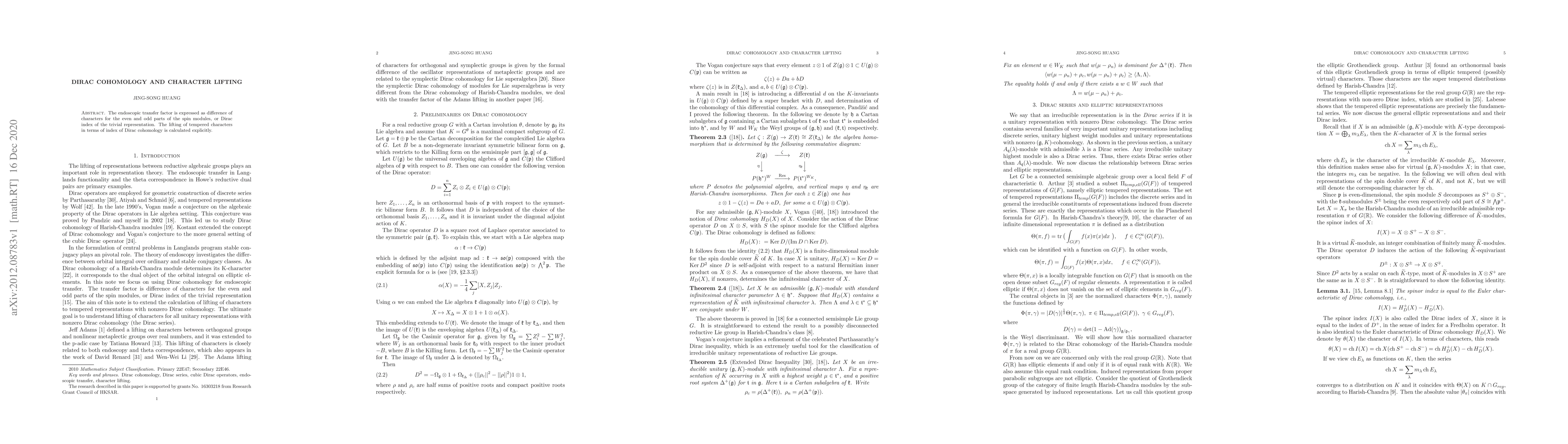 Summary: This paper explores the relationship between the endoscopic transfer factor and Dirac cohomology, demonstrating how it can be expressed as the difference between the even and odd parts of spin modules. It also provides an explicit calculation of the lifting of tempered characters via the Dirac index of the trivial representation.