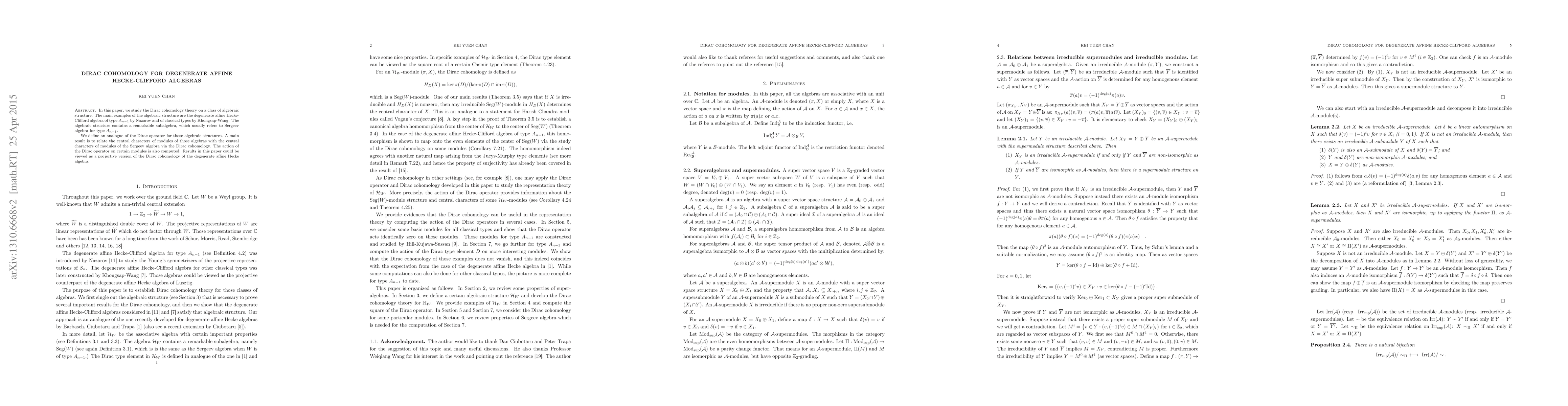 The introduction and analysis of a Dirac operator within the context of the degenerate affine Hecke-Clifford algebra, along with the establishment of a connection to the Sergeev algebra through Dirac cohomology.