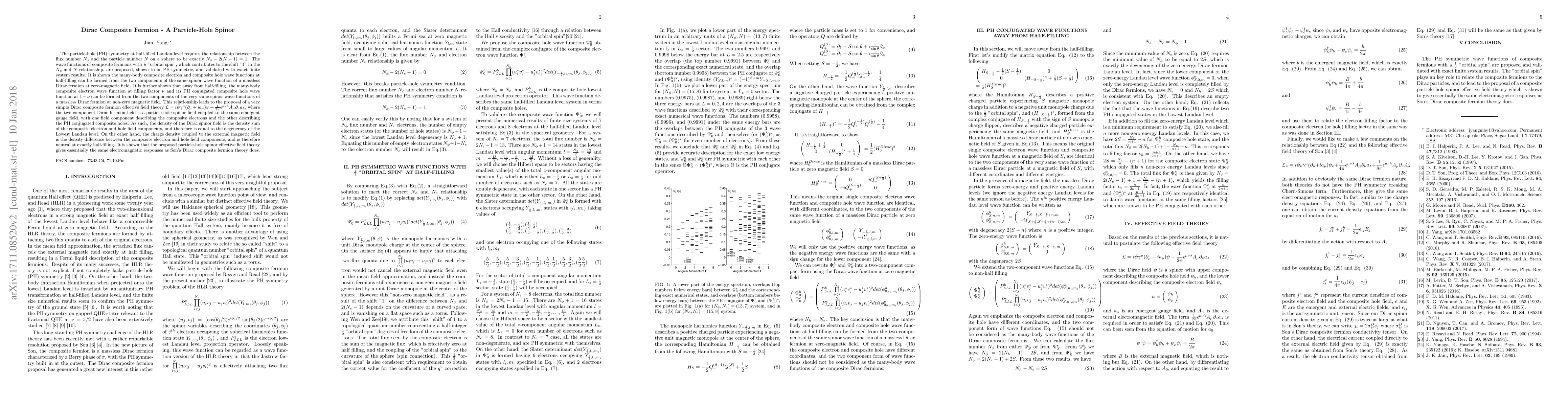 The particle-hole (PH) symmetry at half-filled Landau level requires the relationship between the flux number N_phi and the particle number N on a sphere to be exactly N_phi - 2(N-1) = 1. The wave functions of composite fermions with 1/2 "orbital spin", which contributes to the shift "1" in the N_phi and N relationship, are proposed, shown to be PH symmetric, and validated with exact finite system results. It is shown the many-body composite electron and composite hole wave functions at half-filling can be formed from the two components of the same spinor wave function of a massless Dirac fermion at zero-magnetic field. It is further shown that away from half-filling, the many-body composite electron wave function at filling factor nu and its PH conjugated composite hole wave function at 1-nu can be formed from the two components of the very same spinor wave functions of a massless Dirac fermion at non-zero magnetic field. This relationship leads to the proposal of a very simple Dirac composite fermion effective field theory, where the two-component Dirac fermion field is a particle-hole spinor field coupled to the same emergent gauge field, with one field component describing the composite electrons and the other describing the PH conjugated composite holes. As such, the density of the Dirac spinor field is the density sum of the composite electron and hole field components, and therefore is equal to the degeneracy of the Lowest Landau level. On the other hand, the charge density coupled to the external magnetic field is the density difference between the composite electron and hole field components, and is therefore neutral at exactly half-filling. It is shown that the proposed particle-hole spinor effective field theory gives essentially the same electromagnetic responses as Son's Dirac composite fermion theory does.
