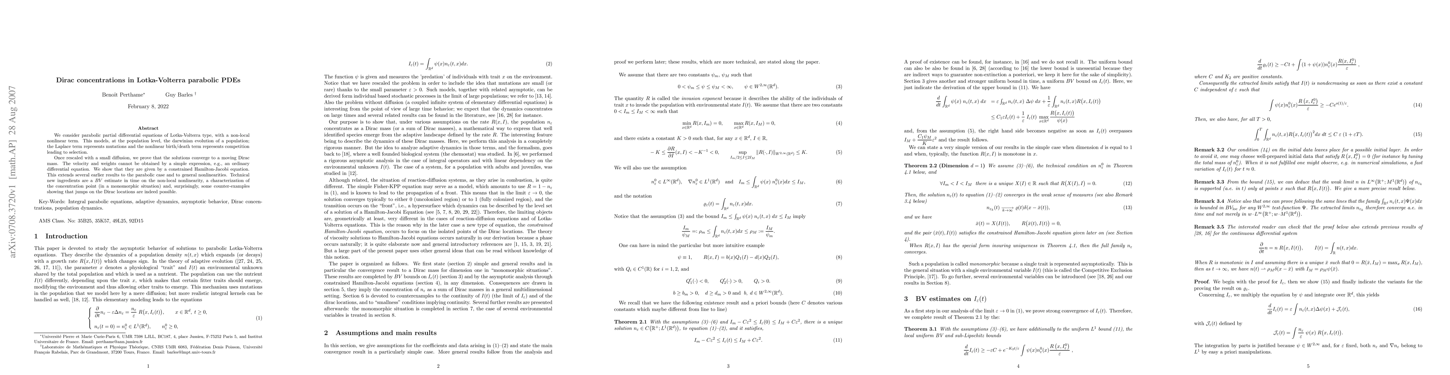 We consider parabolic partial differential equations of Lotka-Volterra type, with a non-local nonlinear term. This models, at the population level, the darwinian evolution of a population; the Laplace term represents mutations and the nonlinear birth/death term represents competition leading to selection. Once rescaled with a small diffusion, we prove that the solutions converge to a moving Dirac mass. The velocity and weights cannot be obtained by a simple expression, e.g., an ordinary differential equation. We show that they are given by a constrained Hamilton-Jacobi equation. This extends several earlier results to the parabolic case and to general nonlinearities. Technical new ingredients are a $BV$ estimate in time on the non-local nonlinearity, a characterization of the concentration point (in a monomorphic situation) and, surprisingly, some counter-examples showing that jumps on the Dirac locations are indeed possible.