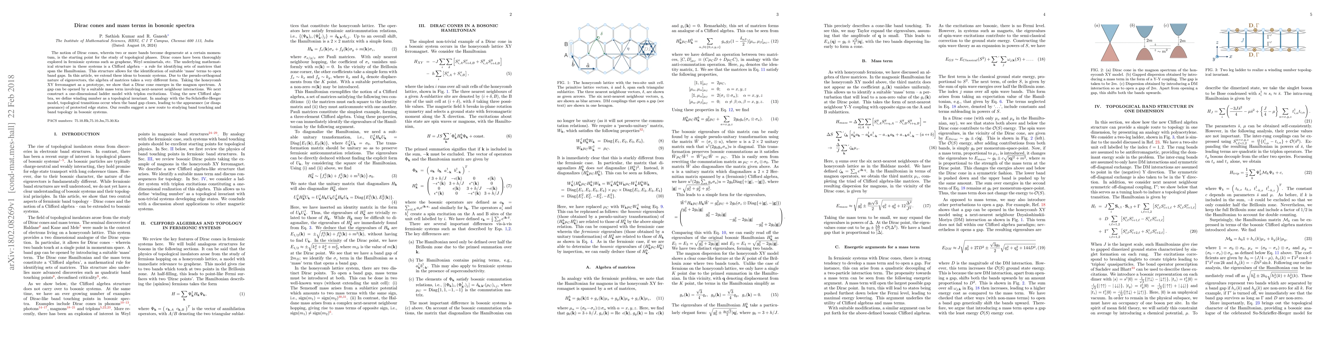 The notion of Dirac cones, wherein two or more bands become degenerate at a certain momentum, is the starting point for the study of topological phases. Dirac cones have been thoroughly explored in fermionic systems such as graphene, Weyl semimetals, etc. The underlying mathematical structure in these systems is a Clifford algebra -- a rule for identifying sets of matrices that span the Hamiltonian. This structure allows for the identification of suitable `mass' terms to open band gaps. In this article, we extend these ideas to bosonic systems. Due to the pseudo-orthogonal nature of eigenvectors, the algebra of matrices takes a very different form. Taking the honeycomb XY ferromagnet as a prototype, we show that a Dirac cone emerges in the magnon spectrum. A gap can be opened by a suitable mass term involving next-nearest neighbour interactions. We next construct a one-dimensional ladder model with triplon excitations. Using the new Clifford algebra, we define winding number as a topological invariant. In analogy with the Su-Schrieffer-Heeger model, topological transitions occur when the band gap closes, leading to the appearance (or disappearance) of protected edge states. Our results suggest a new route to studying band touching and band topology in bosonic systems.