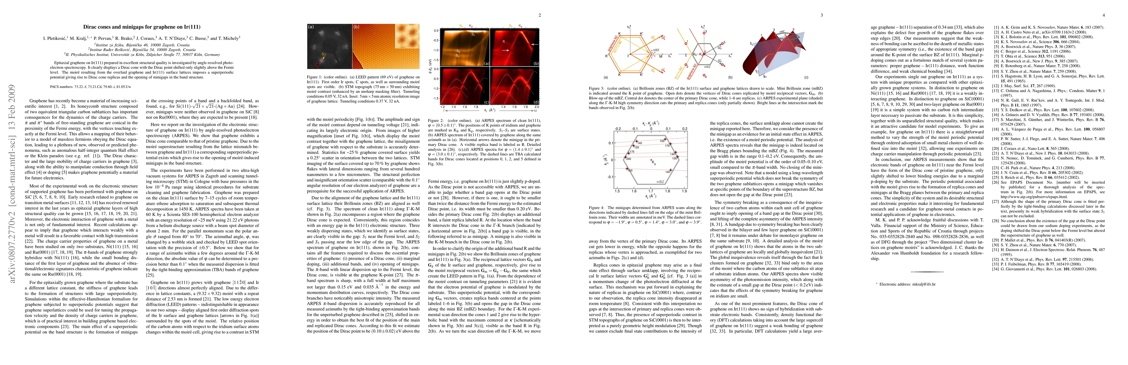 Epitaxial graphene on Ir(111) prepared in excellent structural quality is investigated by angle-resolved photoelectron spectroscopy. It clearly displays a Dirac cone with the Dirac point shifted only slightly above the Fermi level. The moire resulting from the overlaid graphene and Ir(111) surface lattices imposes a superperiodic potential giving rise to Dirac cone replicas and the opening of minigaps in the band structure.