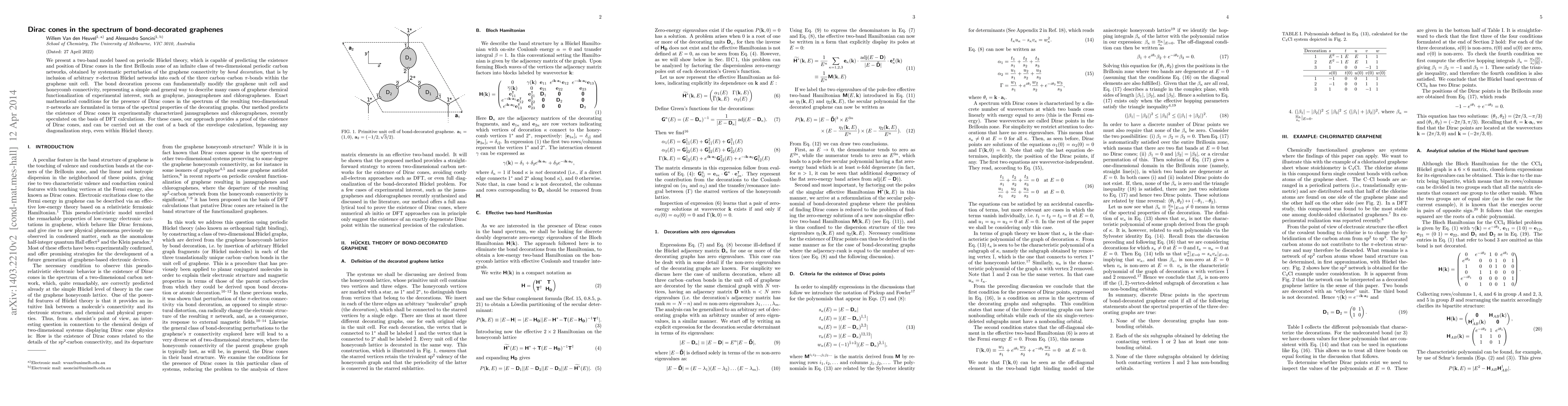 This paper proposes a two-band model using periodic H\"uckel theory to predict the existence and position of Dirac cones in bond-decorated graphenes. It provides exact conditions for Dirac cones based on the spectral properties of the decorating $\pi$-electron networks, confirming their presence in experimentally relevant functionalized graphenes like janusgraphenes and chlorographenes.