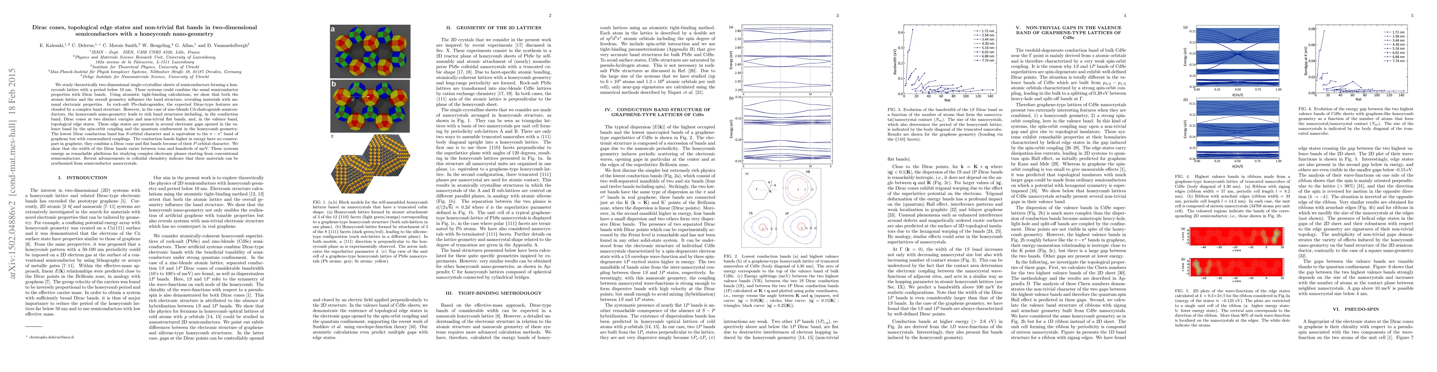 We study theoretically two-dimensional single-crystalline sheets of semiconductors that form a honeycomb lattice with a period below 10 nm. These systems could combine the usual semiconductor properties with Dirac bands. Using atomistic tight-binding calculations, we show that both the atomic lattice and the overall geometry influence the band structure, revealing materials with unusual electronic properties. In rocksalt Pb chalcogenides, the expected Dirac-type features are clouded by a complex band structure. However, in the case of zinc-blende Cd-chalcogenide semiconductors, the honeycomb nanogeometry leads to rich band structures, including, in the conduction band, Dirac cones at two distinct energies and nontrivial flat bands and, in the valence band, topological edge states. These edge states are present in several electronic gaps opened in the valence band by the spin-orbit coupling and the quantum confinement in the honeycomb geometry. The lowest Dirac conduction band has S-orbital character and is equivalent to the pi-pi* band of graphene but with renormalized couplings. The conduction bands higher in energy have no counterpart in graphene; they combine a Dirac cone and flat bands because of their P-orbital character. We show that the width of the Dirac bands varies between tens and hundreds of meV. These systems emerge as remarkable platforms for studying complex electronic phases starting from conventional semiconductors. Recent advancements in colloidal chemistry indicate that these materials can be synthesized from semiconductor nanocrystals.