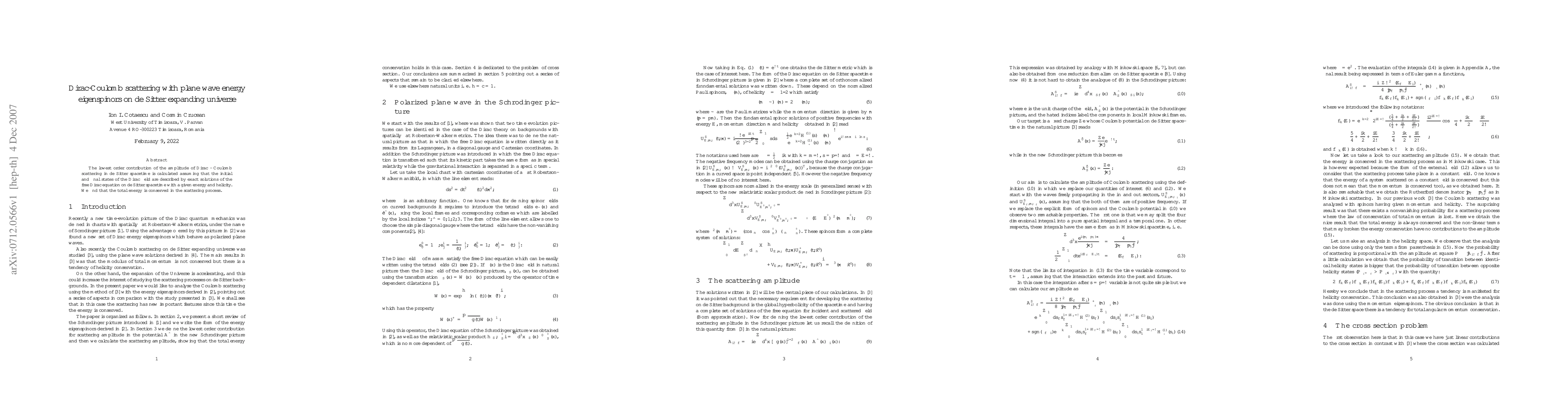 Summary: This paper calculates the lowest order amplitude for Dirac-Coulomb scattering in de Sitter spacetime using plane wave energy eigenspinors, confirming energy conservation in the process. The study employs exact solutions of the free Dirac equation on de Sitter.