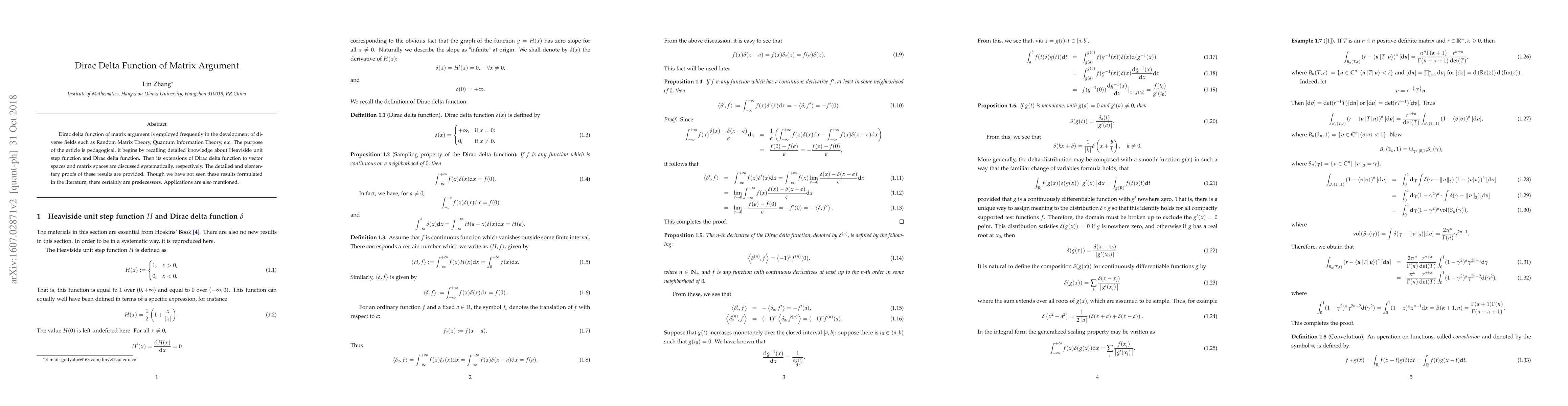 This paper pedagogically explores the Dirac delta function extended to matrix arguments, beginning with foundational knowledge of the Dirac delta and Heaviside functions. It systematically extends these concepts to vector and matrix spaces, providing detailed proofs, and mentions applications in fields like Random Matrix Theory and Quantum Information Theory.