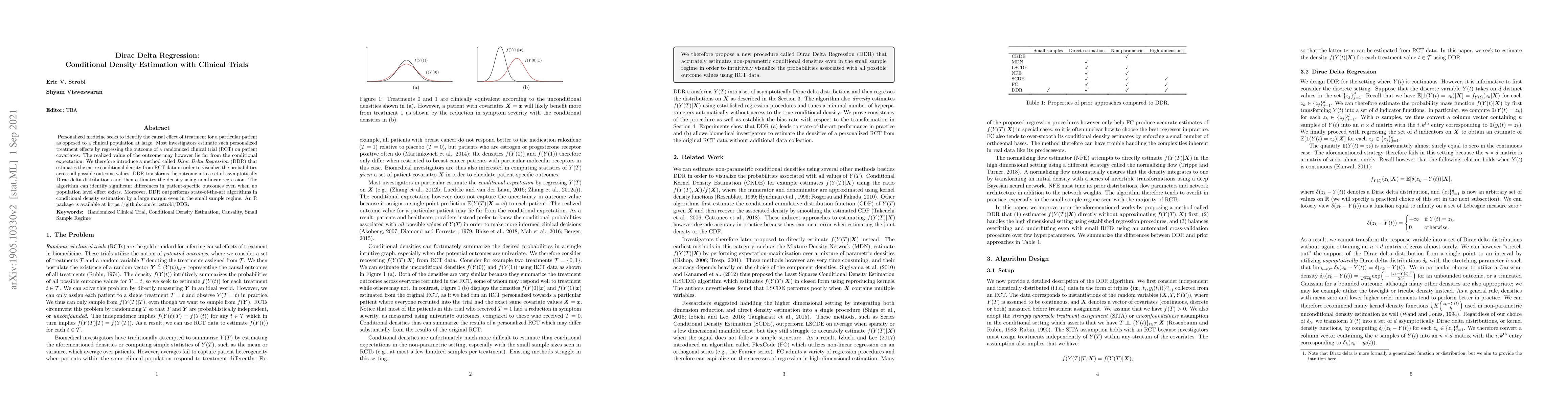 Personalized medicine seeks to identify the causal effect of treatment for a particular patient as opposed to a clinical population at large. Most investigators estimate such personalized treatment effects by regressing the outcome of a randomized clinical trial (RCT) on patient covariates. The realized value of the outcome may however lie far from the conditional expectation. We therefore introduce a method called Dirac Delta Regression (DDR) that estimates the entire conditional density from RCT data in order to visualize the probabilities across all possible outcome values. DDR transforms the outcome into a set of asymptotically Dirac delta distributions and then estimates the density using non-linear regression. The algorithm can identify significant differences in patient-specific outcomes even when no population level effect exists. Moreover, DDR outperforms state-of-the-art algorithms in conditional density estimation by a large margin even in the small sample regime. An R package is available at https://github.com/ericstrobl/DDR.