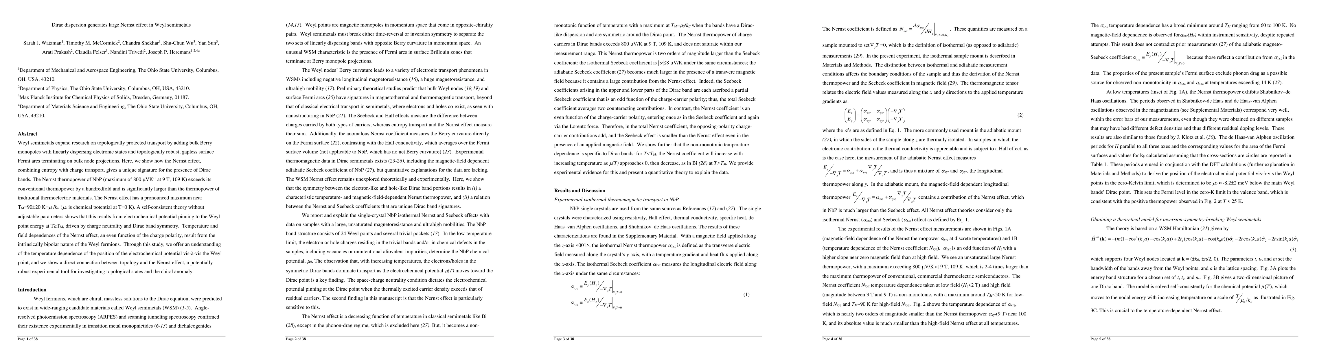 This research demonstrates a large Nernst effect in Weyl semimetals due to Dirac dispersion, with NbP showing a thermopower a hundred times greater than conventional materials. The effect correlates with electrochemical potential pinning at the Weyl point, providing a unique signature of topological states and the chiral anomaly.
