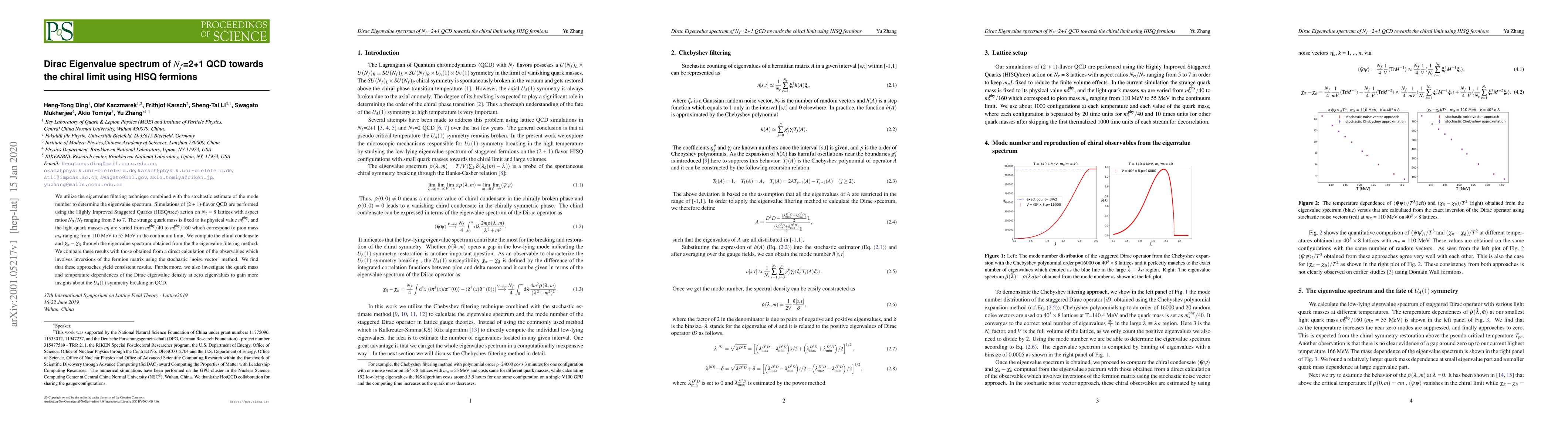 We utilize the eigenvalue filtering technique combined with the stochastic estimate of the mode number to determine the eigenvalue spectrum. Simulations of (2 + 1)-flavor QCD are performed using the Highly Improved Staggered Quarks (HISQ/tree) action on $N_{\tau}$ = 8 lattices with aspect ratios $N_{\sigma}/N_{\tau}$ ranging from 5 to 7. The strange quark mass is fixed to its physical value $m_{s}^{\rm phy}$, and the light quark masses $m_{l}$ are varied from $m_{s}^{\rm phy}/40$ to $m_{s}^{\rm phy}/160$ which correspond to pion mass $m_{\pi}$ ranging from 110 MeV to 55 MeV in the continuum limit. We compute the chiral condensate and $\chi_{\pi} - \chi_{\delta}$ through the eigenvalue spectrum obtained from the the eigenvalue filtering method. We compare these results with those obtained from a direct calculation of the observables which involves inversions of the fermion matrix using the stochastic "noise vector" method. We find that these approaches yield consistent results. Furthermore, we also investigate the quark mass and temperature dependences of the Dirac eigenvalue density at zero eigenvalues to gain more insights about the $U_A(1)$ symmetry breaking in QCD.