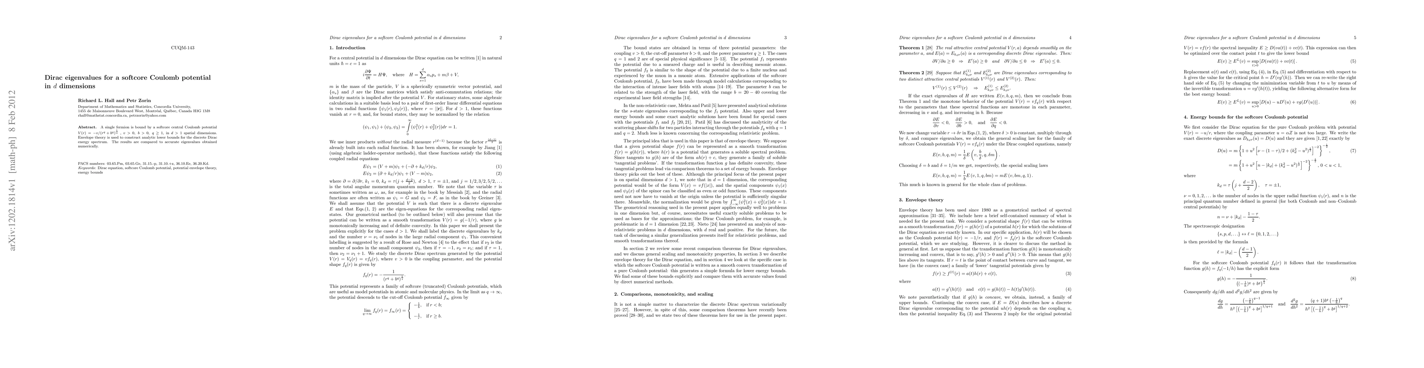 A single fermion is bound by a softcore central Coulomb potential V(r) = -v/(r^q + b^q)^(1/q), v>0, b>0, q \ge 1, in d>1 spatial dimensions. Envelope theory is used to construct analytic lower bounds for the discrete Dirac energy spectrum. The results are compared to accurate eigenvalues obtained numerically.