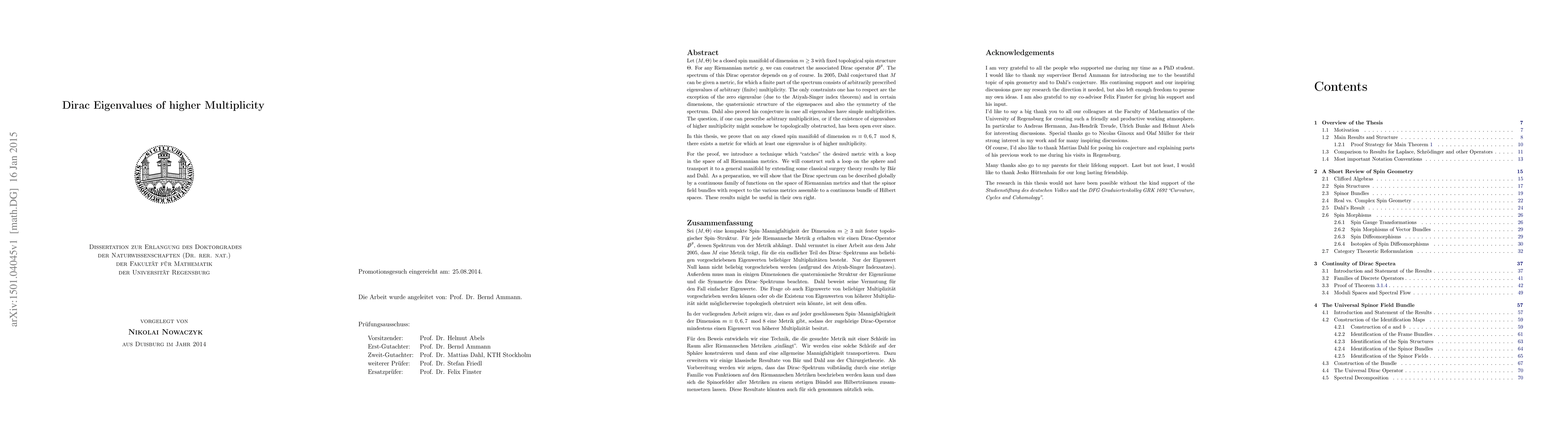 Researchers prove that on certain spin manifolds, a metric exists for which at least one Dirac eigenvalue has higher multiplicity than initially thought possible.