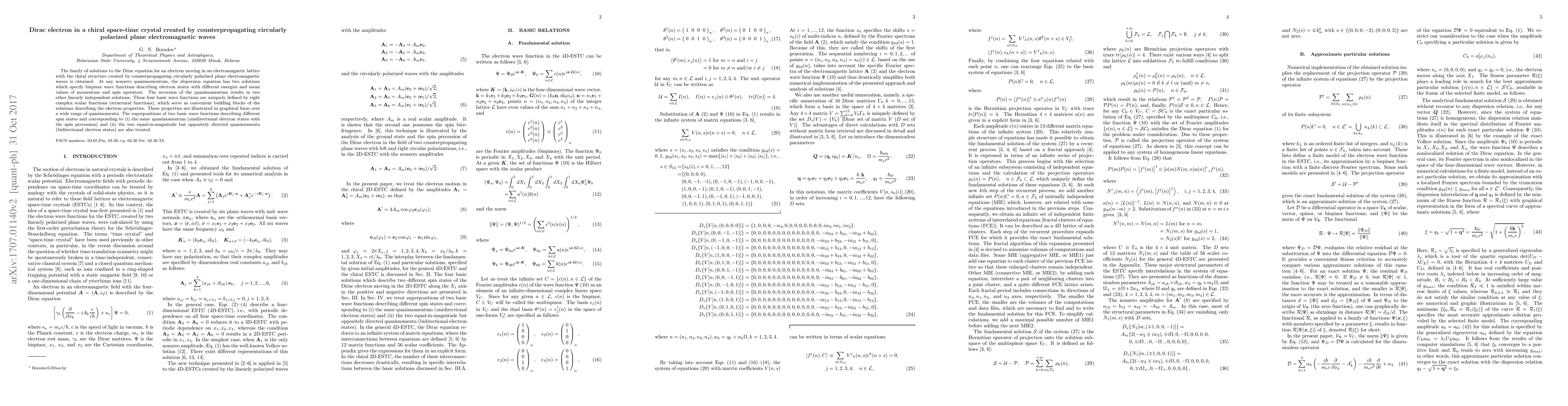 The family of solutions to the Dirac equation for an electron moving in an electromagnetic lattice with the chiral structure created by counterpropagating circularly polarized plane electromagnetic waves is obtained. At any nonzero quasimomentum, the dispersion equation has two solutions which specify bispinor wave functions describing electron states with different energies and mean values of momentum and spin operators. The inversion of the quasimomentum results in two other linearly independent solutions. These four basic wave functions are uniquely defined by eight complex scalar functions (structural functions), which serve as convenient building blocks of the relations describing the electron properties. These properties are illustrated in graphical form over a wide range of quasimomentums. The superpositions of two basic wave functions describing different spin states and corresponding to (i) the same quasimomentum (unidirectional electron states with the spin precession) and (ii) the two equal-in-magnitude but oppositely directed quasimomentums (bidirectional electron states) are also treated.
