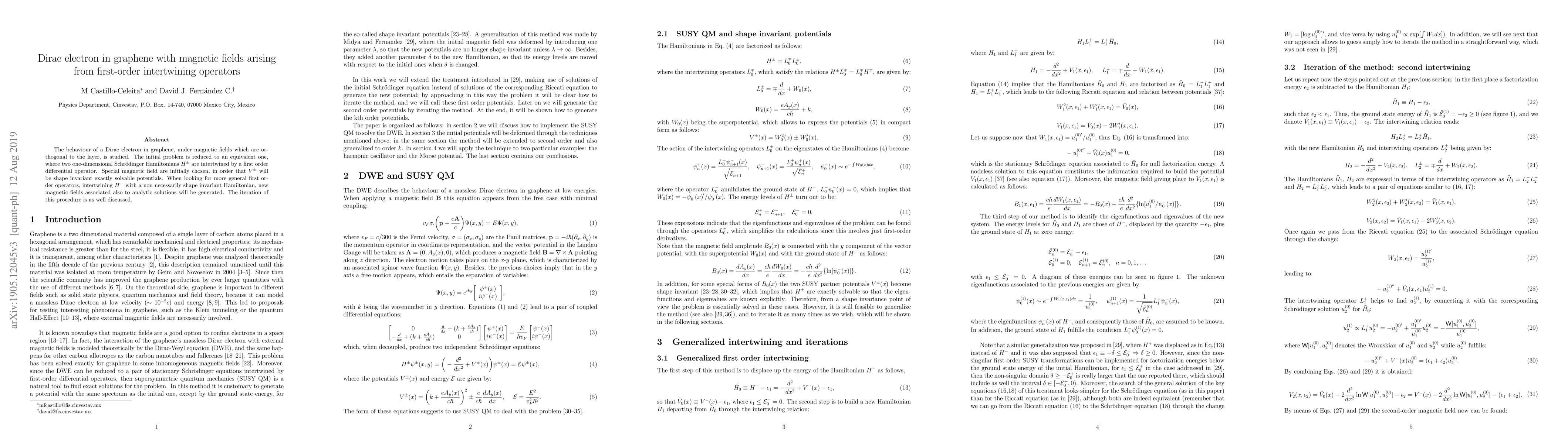 This paper investigates the behavior of Dirac electrons in graphene under perpendicular magnetic fields, reducing the problem to intertwined one-dimensional Schrödinger Hamiltonians. It explores specific magnetic field configurations that yield exactly solvable potentials, and discusses the generation of new magnetic fields through general first-order intertwining operators.