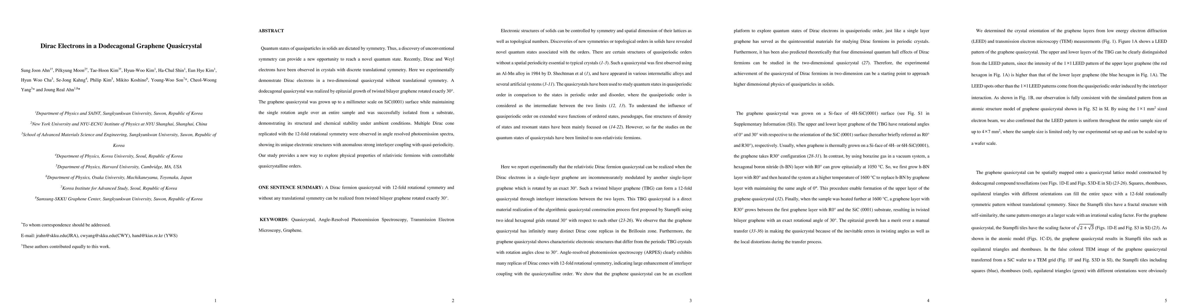 The study experimentally reveals Dirac electrons in a two-dimensional dodecagonal graphene quasicrystal grown by twisting a bilayer graphene. The quasicrystal exhibits multiple Dirac cones with 12-fold rotational symmetry, highlighting unique electronic structures and strong interlayer coupling.