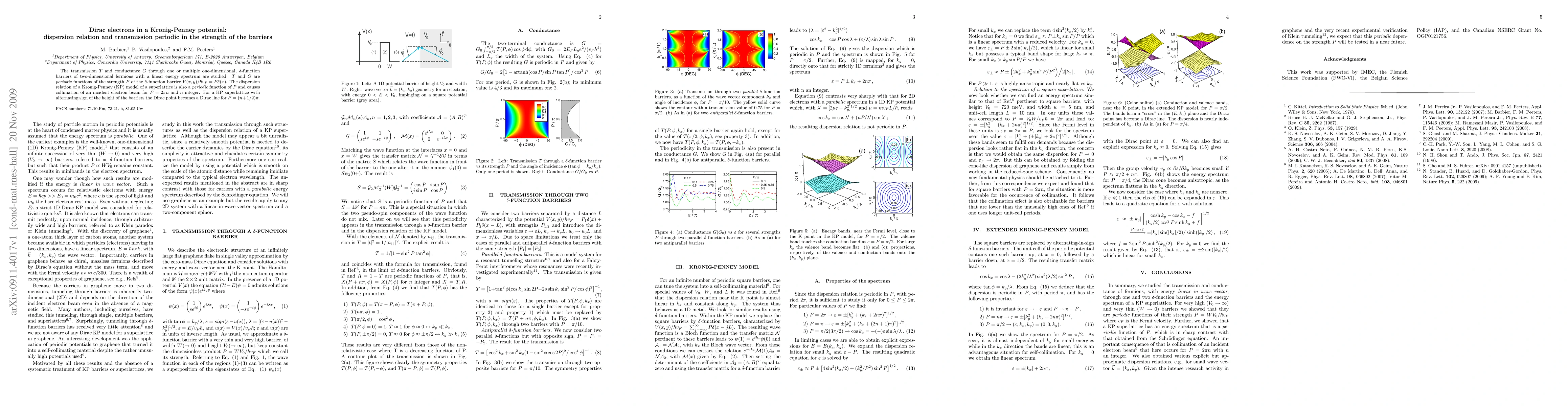 The transmission T and conductance G through one or multiple one-dimensional, delta-function barriers of two-dimensional fermions with a linear energy spectrum are studied. T and G are periodic functions of the strength P of the delta-function barrier V(x,y) / hbar v_F = P delta(x). The dispersion relation of a Kronig-Penney (KP) model of a superlattice is also a periodic function of P and causes collimation of an incident electron beam for P = 2 pi n and n integer. For a KP superlattice with alternating sign of the height of the barriers the Dirac point becomes a Dirac line for P = (n + 1/2) pi.