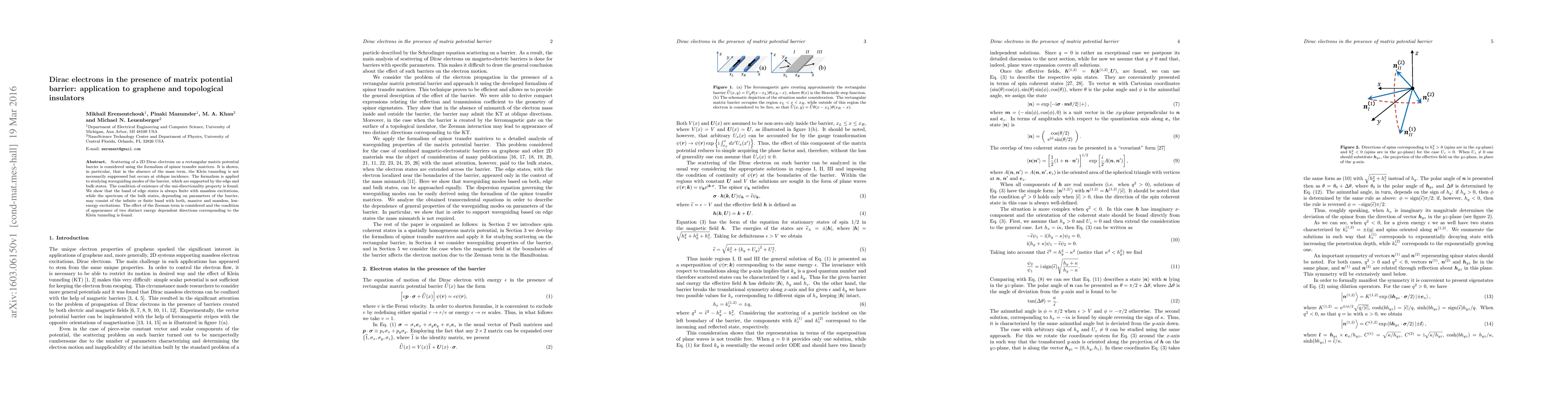 This paper explores the scattering of Dirac electrons on a matrix potential barrier using spinor transfer matrices, demonstrating that Klein tunneling can occur at oblique incidence without a mass term. It applies the formalism to graphene and topological insulators, revealing finite edge states and variable bulk states, and discusses the impact of the Zeeman term on energy-dependent Klein tunneling directions.