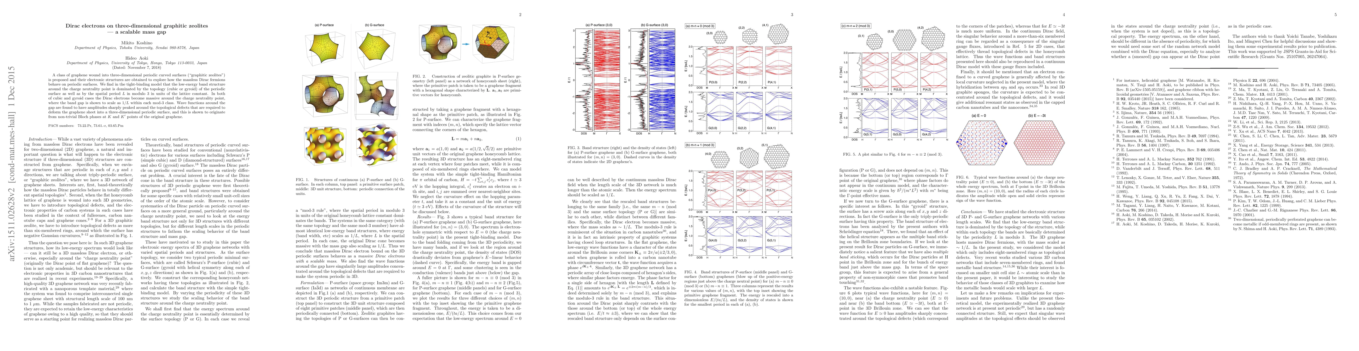 This paper proposes a new class of three-dimensional graphitic zeolites formed by winding graphene into periodic curved surfaces, revealing that Dirac electrons become massive around the charge neutrality point. The resulting band gap scales inversely with the spatial period, and wave functions near the gap are concentrated around topological defects.