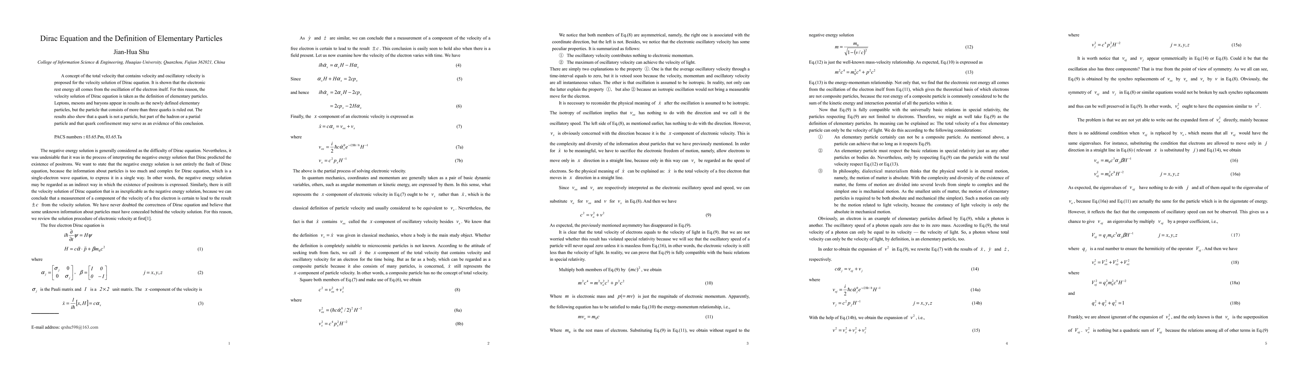A concept of the total velocity that contains velocity and oscillatory velocity is proposed for the velocity solution of Dirac equation. It is shown that the electronic rest energy all comes from the oscillation of the electron itself. For this reason, the velocity solution of Dirac equation is taken as the definition of elementary particles. Leptons, mesons and baryons appear in results as the newly defined elementary particles, but the particle that consists of more than three quarks is ruled out. The results also show that a quark is not a particle, but part of the hadron or a partial particle and that quark confinement may serve as an evidence of this conclusion.