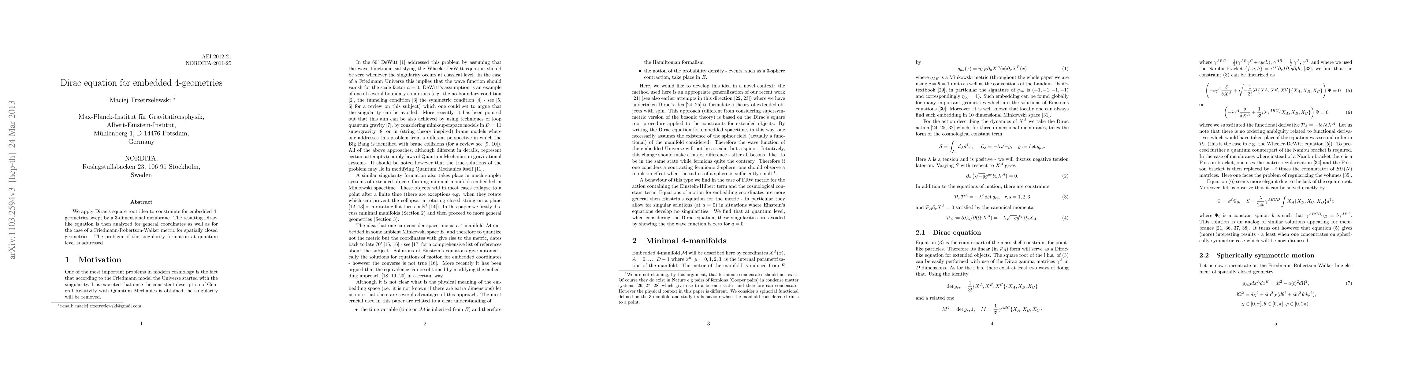 We apply Dirac's square root idea to constraints for embedded 4-geometries swept by a 3-dimensional membrane. The resulting Dirac-like equation is then analyzed for general coordinates as well as for the case of a Friedmann-Robertson-Walker metric for spatially closed geometries. The problem of the singularity formation at quantum level is addressed.