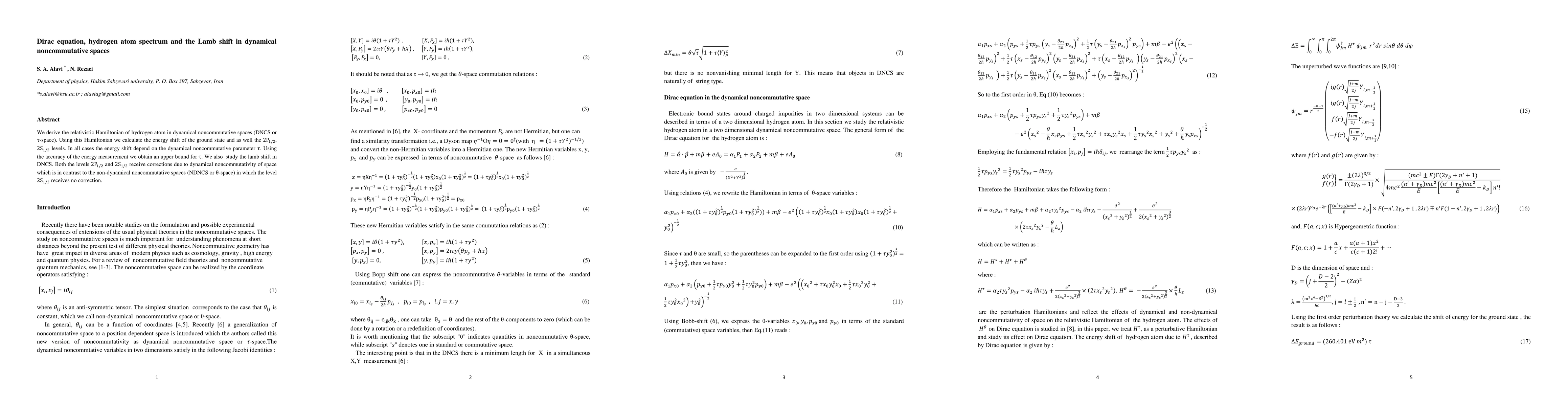 This paper derives the relativistic Hamiltonian for the hydrogen atom in dynamical noncommutative spaces (DNCS) and calculates the energy shifts for ground state and [2P]_(1/2), [2S]_(1/2) levels, finding that they all depend on the noncommutative parameter τ. It also provides an upper bound for τ based on energy measurement accuracy and discusses the Lamb shift, showing corrections in both [2P]_(1/2) and [2S]_(1/2) levels due to DNCS.